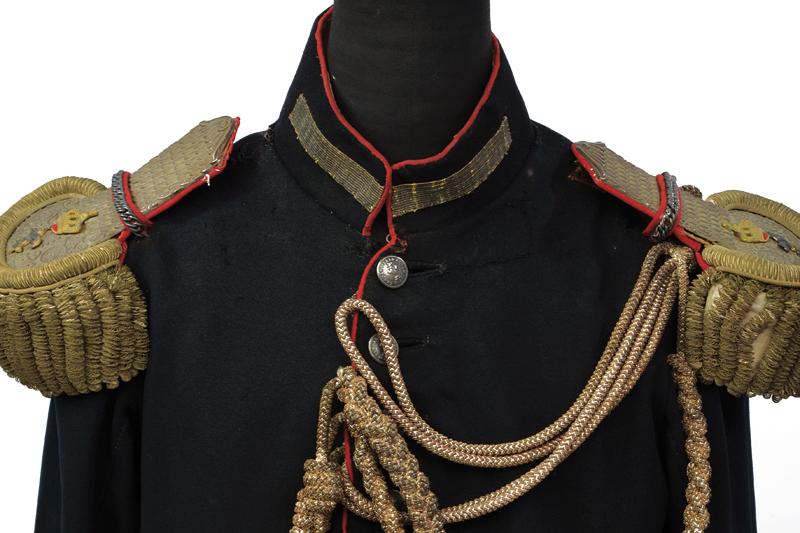 Uniforme da ufficiale della Gendarmeria Borbonica, datazione: 1845 circa provenienza: Regno delle Due Sicilie, Composta da: marsina, pantaloni, spalline e cordelline.Marsina in condizioni accettabili data l'epoca, con le caratteristiche 'granate' bicolore tipiche della specialità. Bellissime grandi spalline per un Maggiore del modello adottato nel 1833. Cordelline in argento sempre presenti in questa Arma. Ottima copia dei pantaloni fedelmente ricalcanti i modelli dell'epoca. altezza 100 cm.