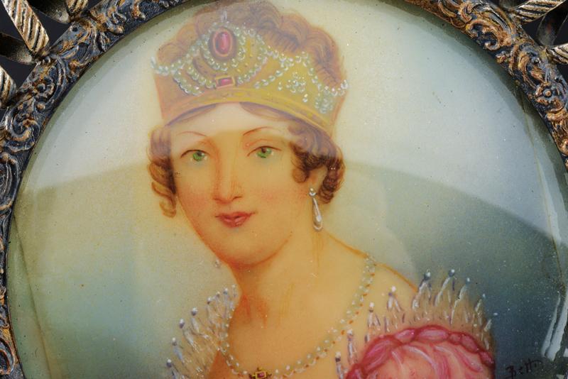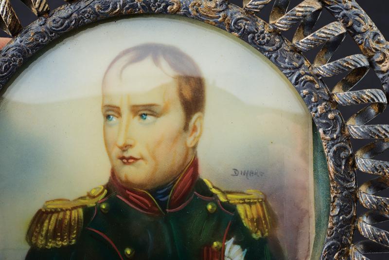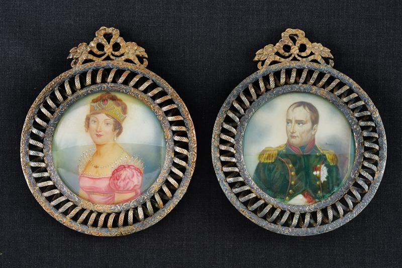 Napoleone I e Maria Luisa d'Austria, datazione: XIX Secolo provenienza: Francia, Due miniature raffiguranti Napoleone I e Maria Luisa d'Austria, entrambe firmate (diversi pittori). In cornice metallica e sotto vetro. diametro 8 cm.