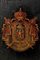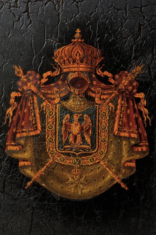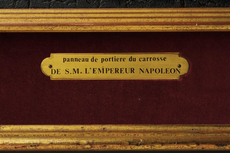 Stemma della famiglia di Napoleone, datazione: XIX Secolo provenienza: Francia, Dipinto su lino in policromia e oro, montato su una tavola di legno. In cornice con bordo interno foderato di velluto con targa in ottone con iscrizione 'Panneau de portiere du carrozze DE S. M. L'EMPEREUR NAPOLEON' (cornice 46.5 x 54.5 cm). dimensioni 26 x 30.5 cm.
