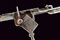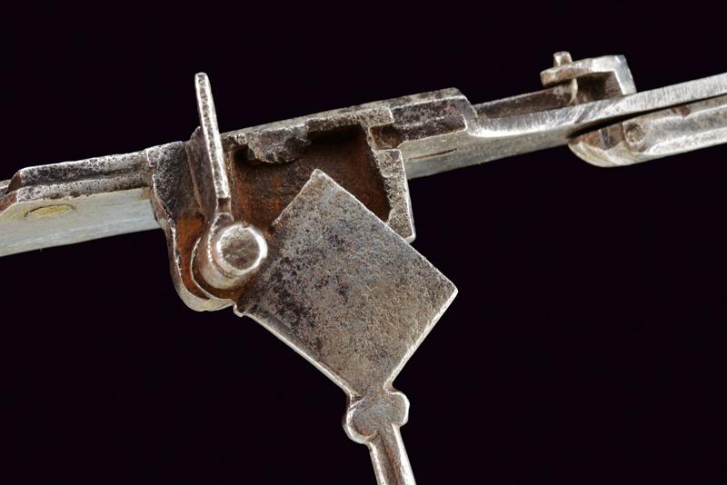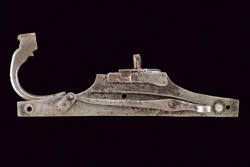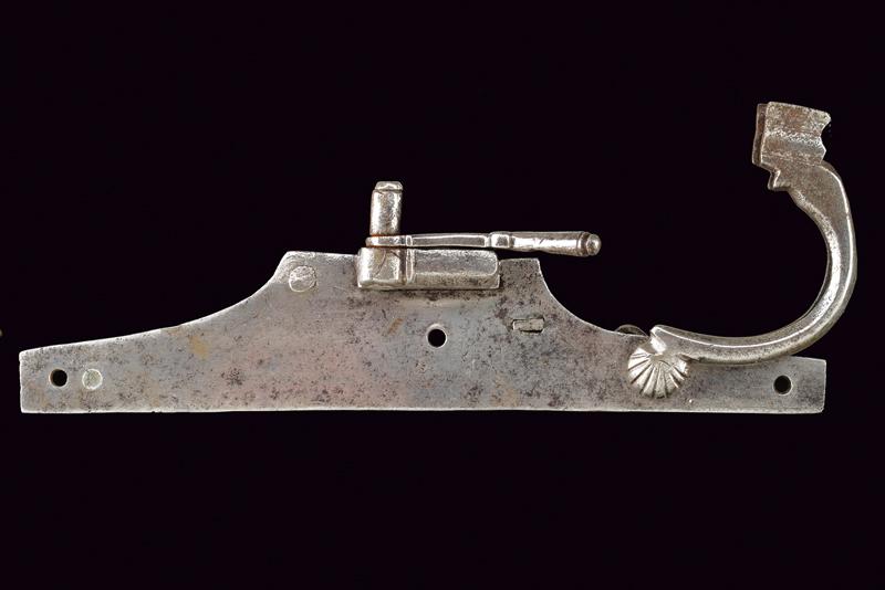 Batteria a miccia per moschetto, datazione: 1600 circa provenienza: Italia, Cartella piatta liscia, allungata verso l'alto nel segmento centrale dove è posto lo scodellino, completo del suo copriscodellino girevole, dotato di lunga manopola, e munito anche di parascintille. La serpentina del tipo bresciano, con base intagliata a conchiglia ed estremità superiore biforcuta. Il retro completo di molle. Cfr: un moschetto con batteria simile nel Museo Nazionale di Artiglieria a Torino, datato attorno al 1600, in 'Armi da Fuoco Italiane' di Gaibi, n. 9 lunghezza plate 18,9 cm.