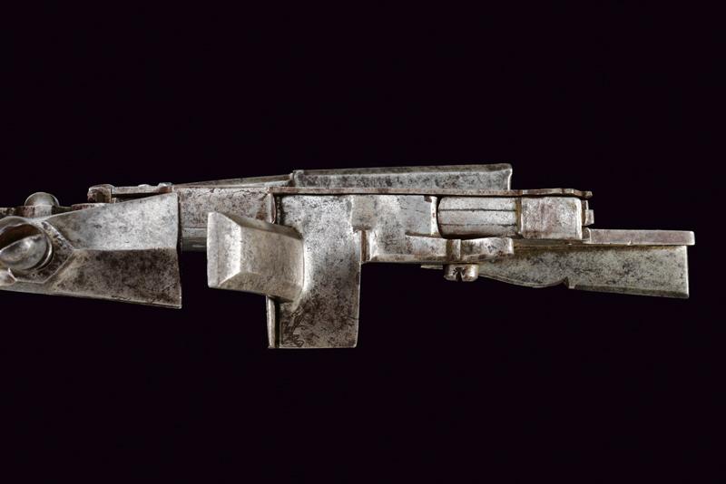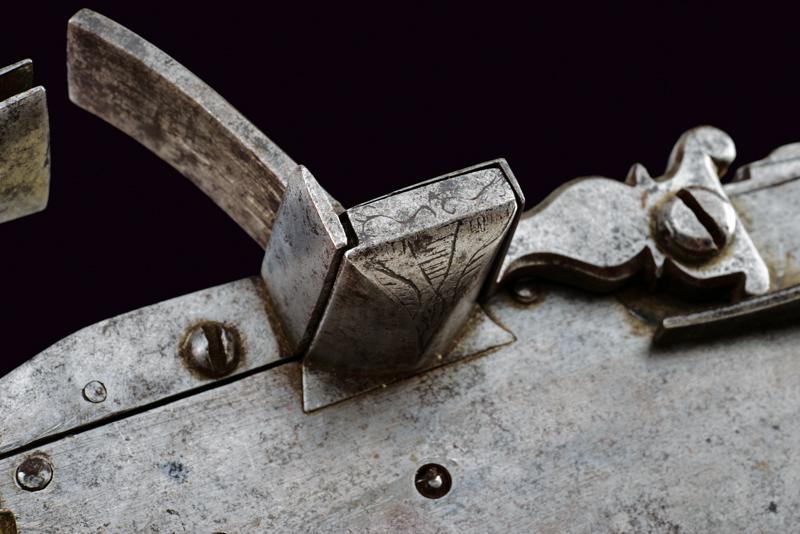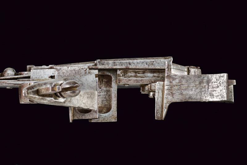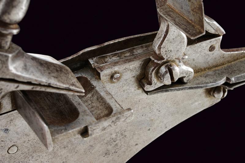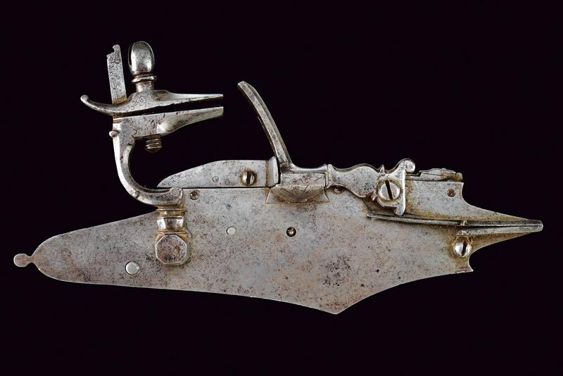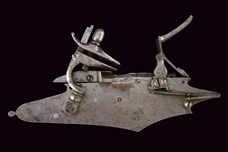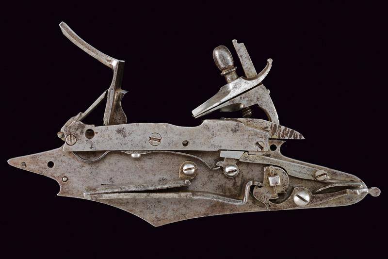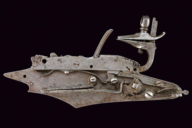 Rara e interessante batteria a pietra a doppio scodellino, datazione: 1620 - 1640 provenienza: Italia del Nord, Con ampia cartella piatta cuspidata ai bordi, con codolo arrotondato e lobato. Il cane con base ottagonale, parte iniziale del collo con nodo e anellature, poi fortemente incurvata, recante resti di piccole incisioni a volute e fiori. La ganscia superiore costolata in mezzeria. Particolare meccanica con due scodellini, quello superiore scorrevole e munito di un canale per per portare la fiammata al secondo focone. Il canale corre a lato della martellina e la meccanica è dotata anche di un doppio copriscodellino: il primo integrato con la martellina, il secondo, incardinato a parte, serve a coprire il canale dello scodellino superiore. lunghezza plate 23,7 cm.