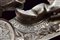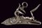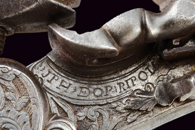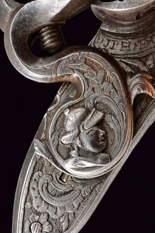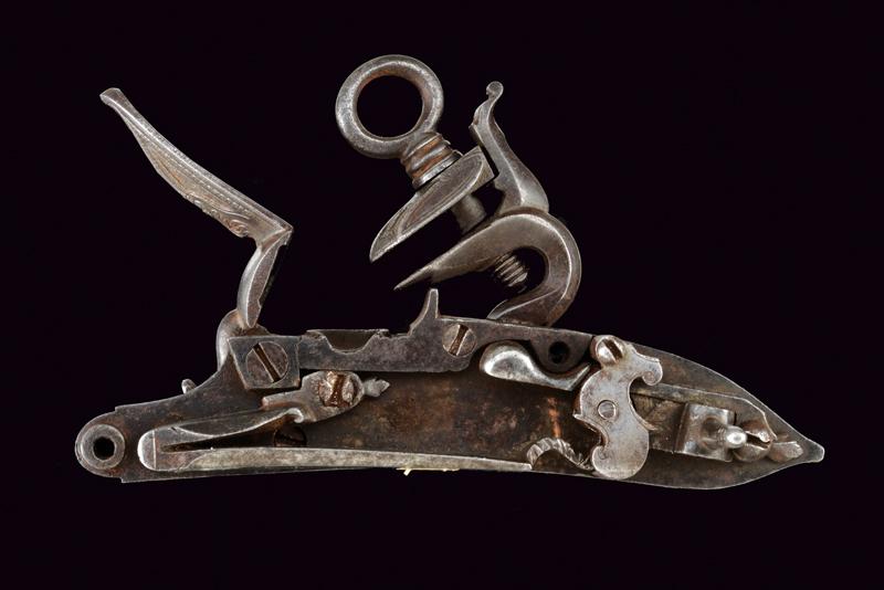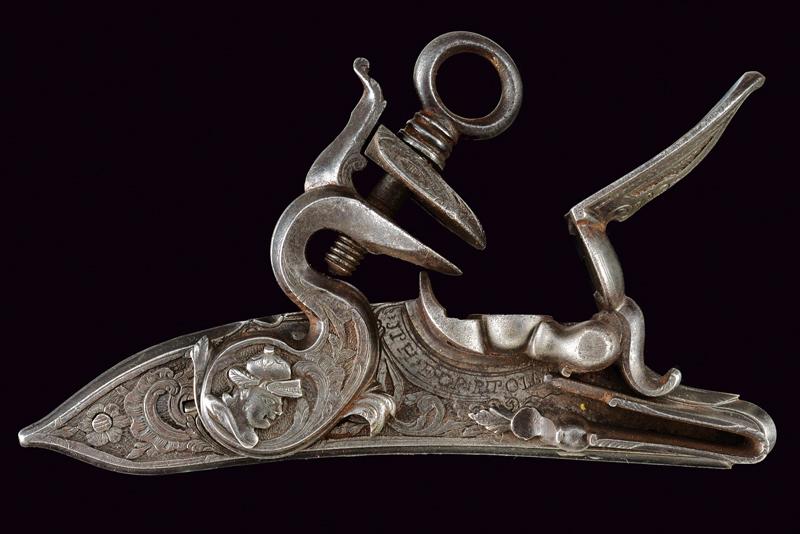 Raffinata batteria a pietra alla moderna , datazione: fine del XVIII Sec. provenienza: Ripoll, Cartella piatta con bordi a taglio obliquo. La codetta incisa e intagliata a rocaille e fiore su fondo a granuli. Il cane a collo di cigno munito di arresti sui fianchi intagliati a foglie; la copertura della vite del cane finemente lavorata in rilievo a effigiare il profilo di un guerriero con elmo, la superficie del collo con foglie in rilievo su fondo granulato. La ganascia superiore intagliata en suite. Scodellino a tenuta stagna, con parascintille. Al centro il cartiglio con la firma 'JPH DOP: RIPOLL', sotto a questo racemi in rilievo su fondo a granuli. Il dorso della martellina con incisione a conchiglia, fiorame e segmenti granulati. Cfr: Vedi una batteria a pietra alla micheletta con firma identica su un fucile spagnolo datato 1790 nella collezione di Giorgio IV del Regno Unito (Royal Collection Trust, RCIN 61443). lunghezza plate 13,8 cm.