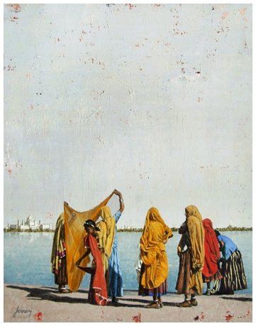 MASSIMO FERRARI Livorno 1955 Donne sulla riva 2013 Olio su tela 50 x 40. Firma in b. a s.; sul verso misure, data, titolo e firma.