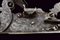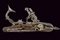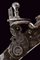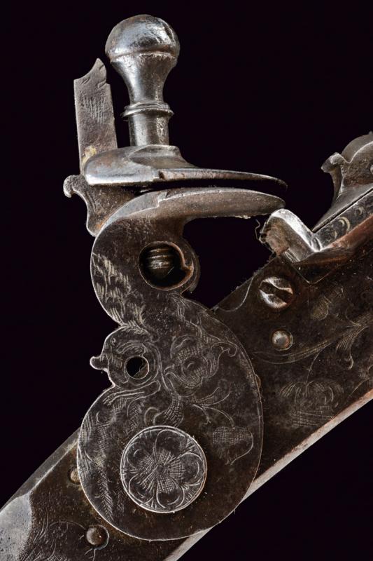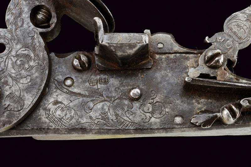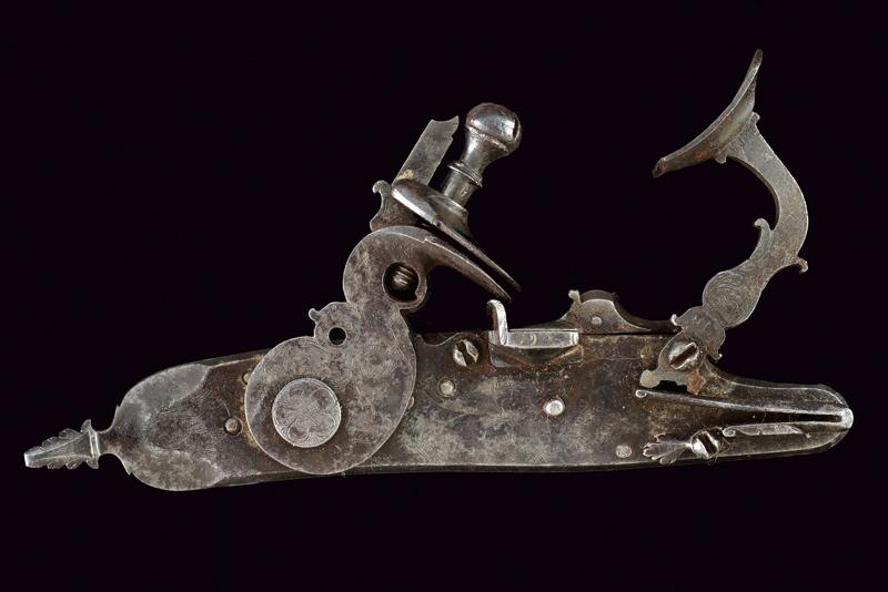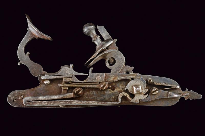 Batteria a pietra alla fiorentina, datazione: secondo quarto del XVIII Sec. provenienza: Area Tosco-Emiliana, In ferro, a cartella piatta a bordi obliqui nella parte posteriore e con codetta munta di bottone lavorato a foglie; piccole incisioni floreali, il cane inciso e con grande vite incisa a fiore; martellina con riccioli intagliati, copriscodellino scorrevole; piccole incisioni e intagli all'interno. lunghezza plate 17 cm.