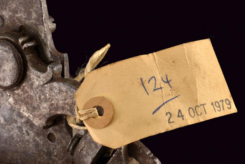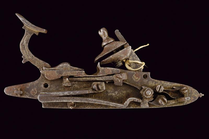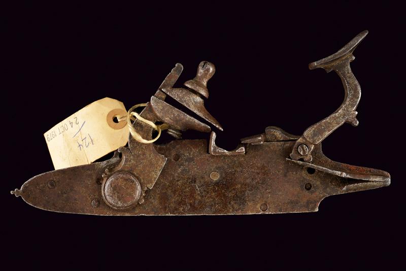 Batteria a pietra alla fiorentina, datazione: terzo quarto del XVII Sec. provenienza: Italia Centro-settentrionale, Cartella piatta cuspidata solo sul lato anteriore e con codetta munita di bottoncino a bocciolo. Cane leggermente controcurvato. Segni del tempo. Cartellino di una vendita del 1979. lunghezza plate 19,7 cm.