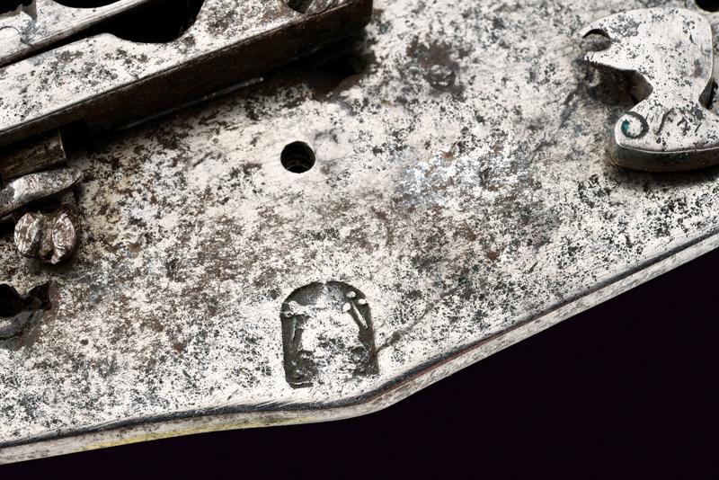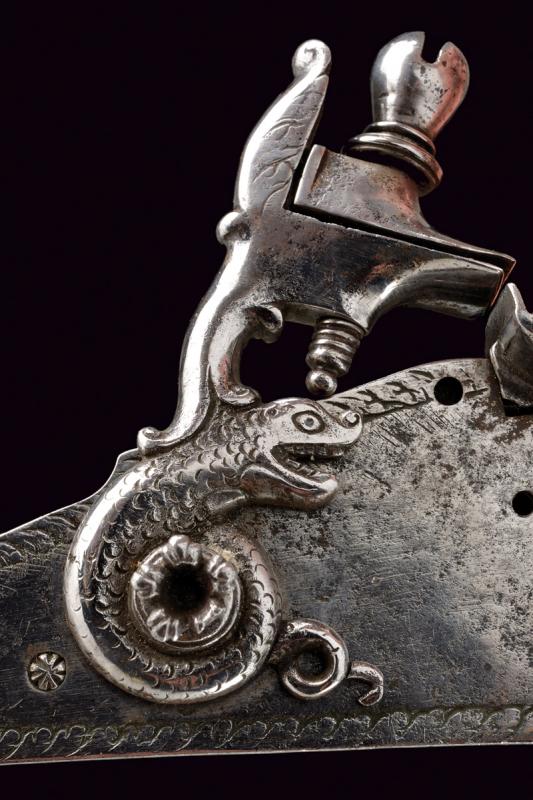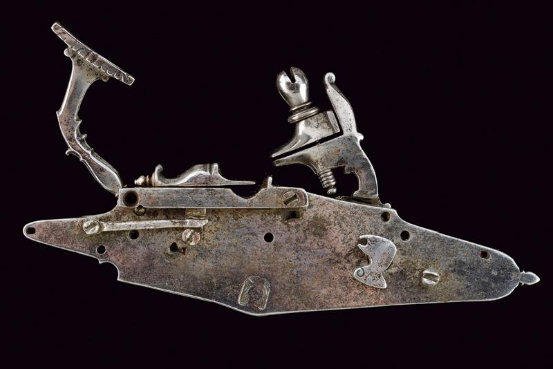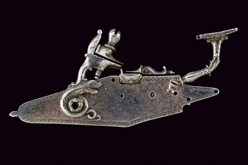 Batteria a pietra alla fiorentina con raro cane, datazione: secondo quarto del XVII Sec. provenienza: Brescia, Cartella piatta a bordi cuspidati e con lobo alla codetta; tutto il margine percorso da una cornicetta incisa a foglie. Bel cane di rara tipologia con base lavorata a serpente in rilievo attorcigliato attorno al vitone e munito di fregio a coda traforato. La testa del vitone intagliata a bocciolo. Dal dorso del serpente parte il secondo segmento del collo con morsetto recante leggere incisioni a foglie sulla cresta. Lo scodellino con mascherone in rilievo sul lato inferiore, il copriscodellino scorrevole. La martellina con molla mancante e collo elegante lavorato a balaustro e foglie. Mancanze alla meccanica sul retro. Il dorso della cartella con resti di un marchio non chiaramente leggibile. lunghezza plate 17,1 cm.