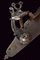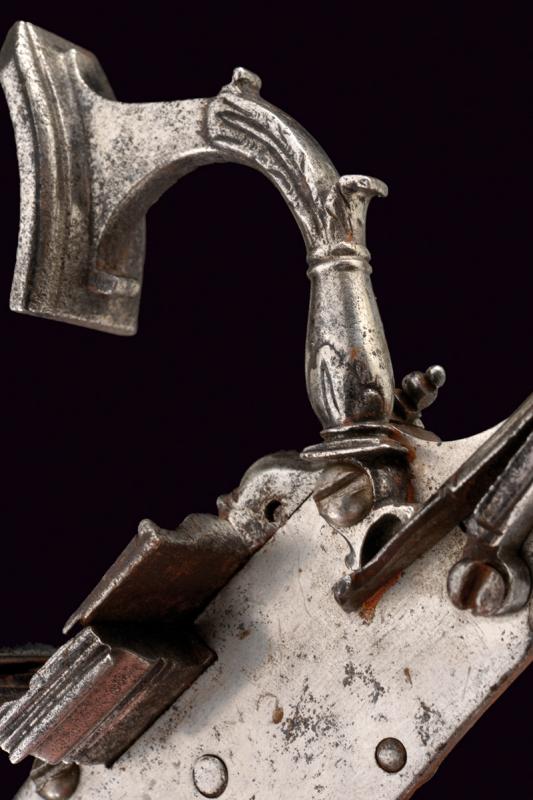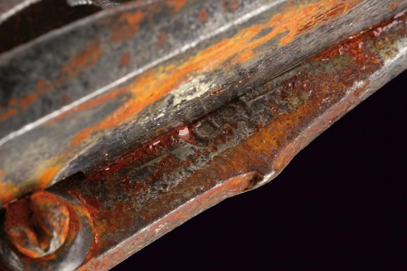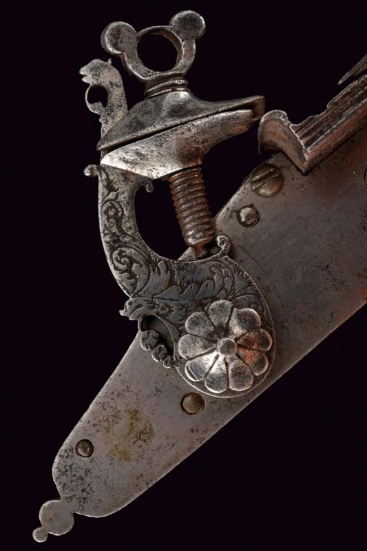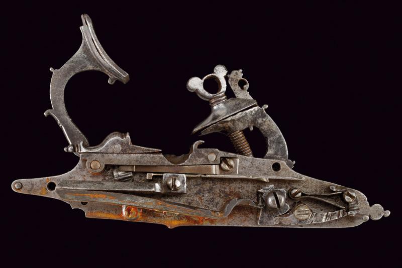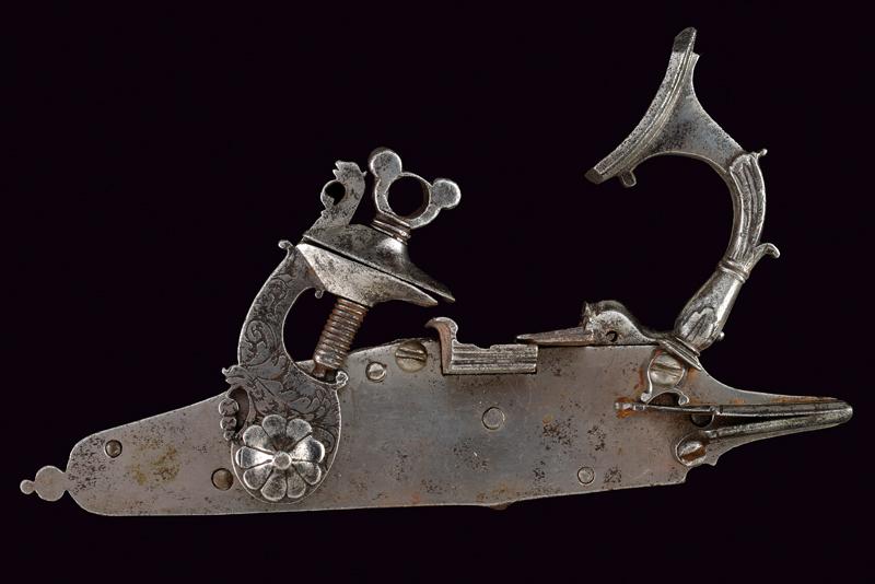 Batteria a pietra alla fiorentina, datazione: metà del XVII Sec. provenienza: Italia Centro-settentrionale, Cartella piatta a bordi cuspidati con codetta munita di doppio lobo. Cane a collo leggermente controcurvato, inciso a foglie e grottesche, con bordi lobati e traforo alla base. La copertura del vitone lavorata a rosetta cuspidata al centro. Scodellino modanato, completo di copriscodellino scorrevole. Martellina con collo a balaustro e foglie intagliate. Il retro con un elemento della meccanica probabilmente di restauro. L'interno della piastra recante il marchio 'SB' (o SR, non chiaramente leggibile). Cfr: 'Armi da Fuoco Italiane', di A. Gaibi, nn. 266. Per un marchio simile vedi Barbiroli 'Marchi e Firme di Archibugiari Italiani'; pag. 152, su una pistola alla fiorentina del 1660 circa con piastra per batteria a ruota riutilizzata per un acciarino alla 'fiorentina arcaica'. lunghezza plate 17,8 cm.