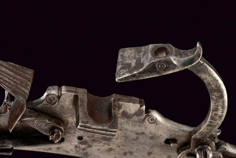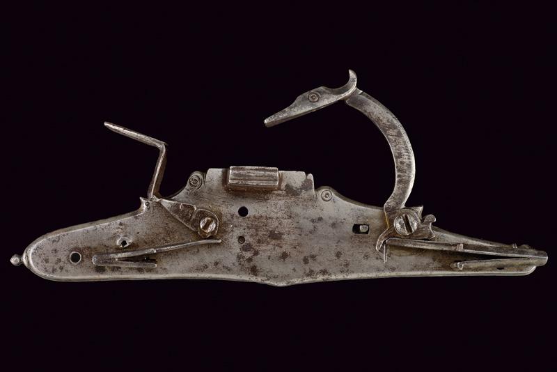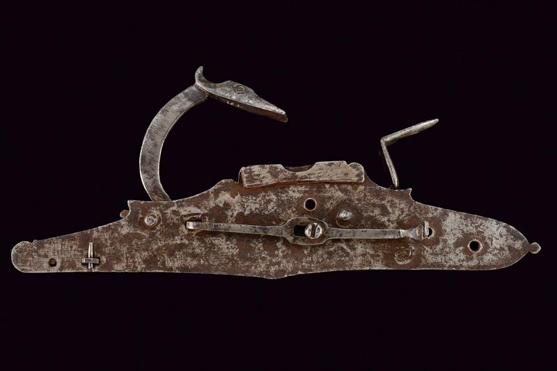 Rara e interessante batteria arcaica a cane rovescio, datazione: primo quarto del XVII Sec. provenienza: Italia del Nord, Cartella piatta con bordi leggermente cuspidati e scantonati, la codetta ornata con piccolo lobo intagliato. La martellina rivolta verso la codetta e munita di molla esterna. Lo scodellino modanato. Cane rovescio sempre a molla esterna, dotato di un semplice meccanismo di ingaggio tramite una leva diretta posta sul retro. La ganascia inferiore mancante. Per una piastra con sistema di molle simili vedi 'Museo Poldi Pezzoli Armeria II', pagg. 662-663 n.828, datato 1620 circa. Vedi anche 'Armi da Fuoco Italiane' di Gaibi, n.195. lunghezza plate 24 cm.
