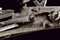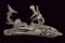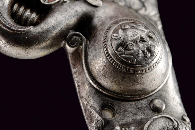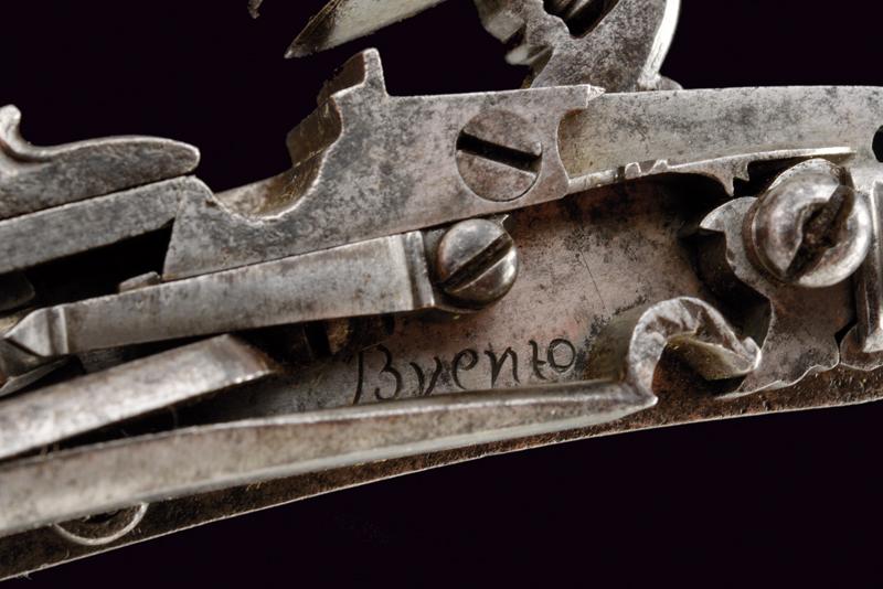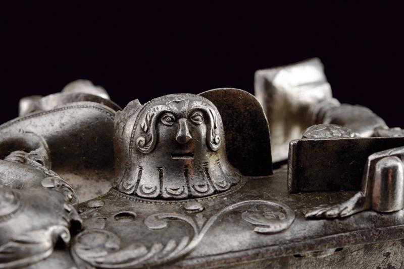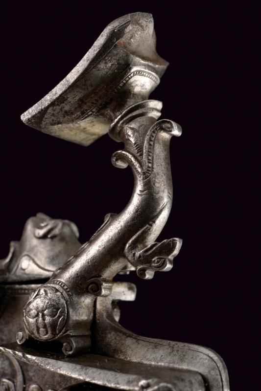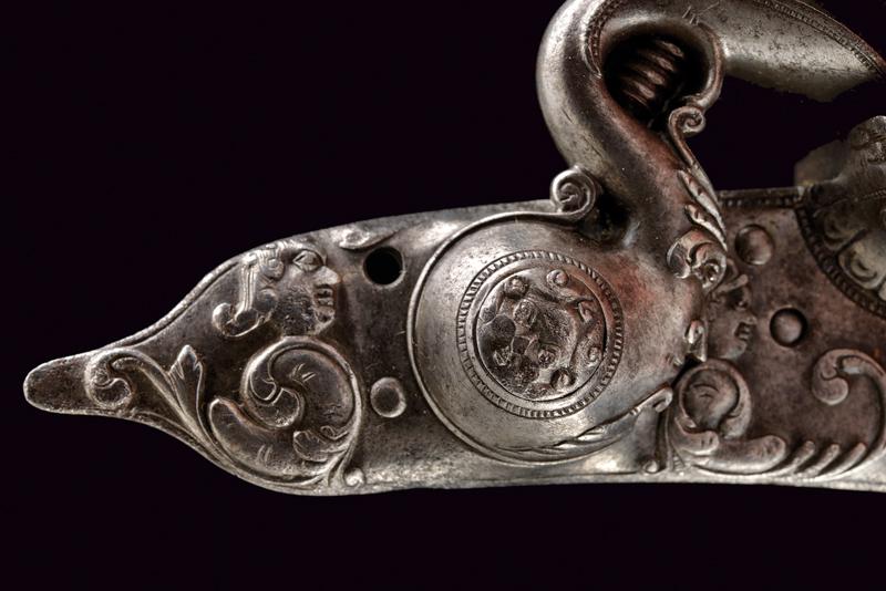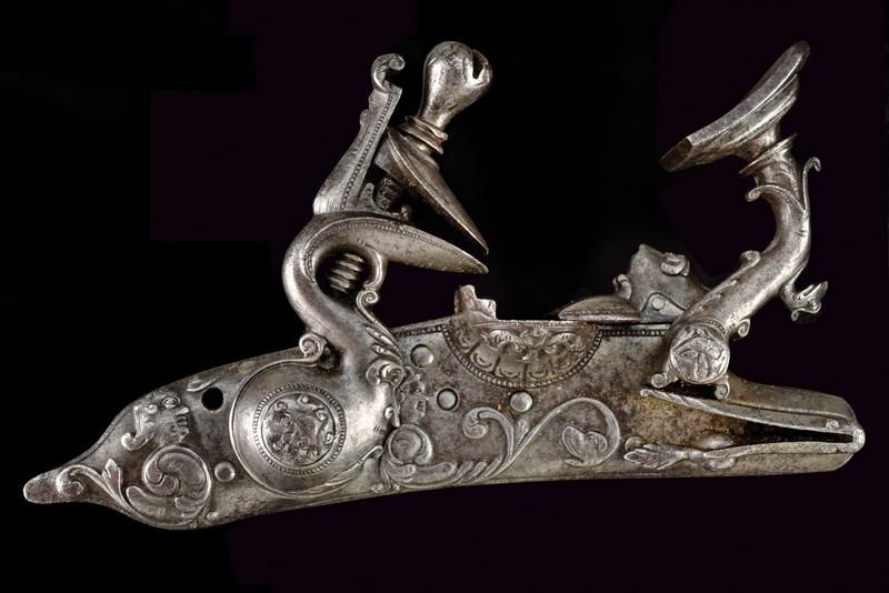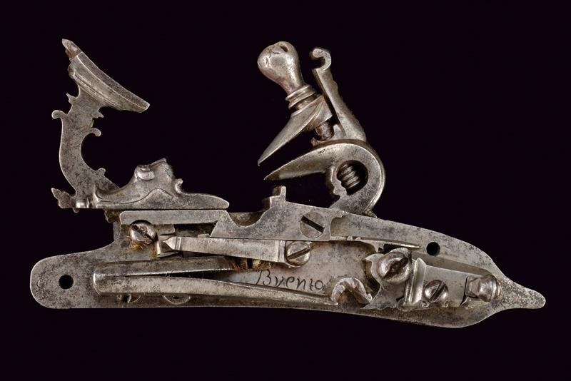 Bella batteria a pietra alla fiorentina de 'Il Negroni' a Brento, datazione: Terzo quarto del XVIII Secolo provenienza: Bologna, Cartella leggermente tondeggiante, ornata a mascheroni grotteschi e volute in rilievo, la vite del cane e della martellina ornate altresì con mascherone sulla testa, il profilo del collo del cane a volto grottesco, il collo della martellina con testa di mostro a tuttotondo. Copriscodellino e fondo dello scodellino anche questi con mascheroni rilevati. Il retro con piccole incisioni e la marcatura 'Brento'. Vista la tipologia, il tema decorativo e la marcatura sul retro certamente un'opera di Francesco Negroni (I) di Brento (Secondo e terzo quarto del XVIII secolo) capostipite dell'omonima stirpe di archibugieri. Vedi 'Repertorio Storico degli Archibugiari Italiani', di B. Barbiroli, pagg. 742-745: Cit. 'Frequentemente si trova all'interno degli acciarini solo la località brento in corsivo [...] Ciò può essere dovuto alla consuetudine di Francesco Negroni di firmare le coppie di pistole [...] disgiuntamente'. lunghezza 10,5 cm.