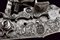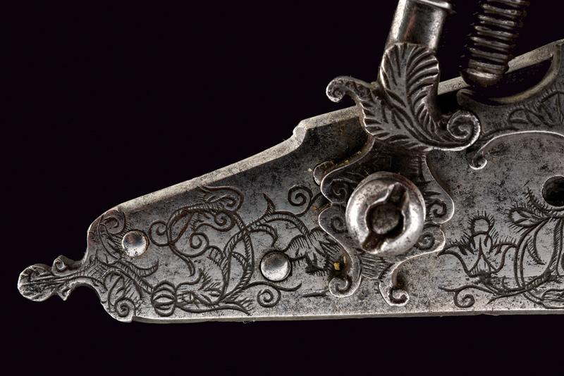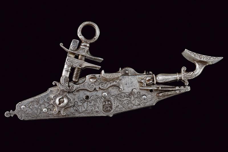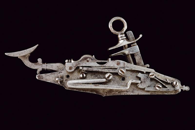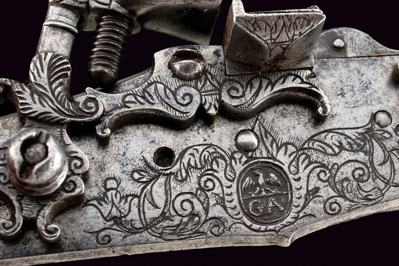 Batteria a pietra alla fiorentina, datazione: secondo quarto del XVII Sec. provenienza: Brescia, Cartella piatta con bordi inclinati con buona parte della superficie incisa a racemi, al centro una marca profondamente punzonata recante aquila ad ali spiegate che sormonta le iniziali 'GA'. Il cane con collo dritto e base incisa e intagliata a ricci, le ganasce incise allo stesso modo sul lato anteriore, la martellina con collo a balaustro. Vari elementi icisi e sagomati a foglie. Vedi un esemplare assai somigliante in 'Brescian Firearms' di N. Di Carpegna, recante il medesimo marchio, tavola XVII, n. 1. Il marchio è riprodotto a pag. 62 (I, 177) indicato come marchio presente su due armi della prima metà del XVII secolo.Per altri esemplari simili per foggia e decorazioni vedi 'Armi da Fuoco Italiane' di Gaibi, nn. 298- 303, tutti di origine bresciana, datati fra il 1625 circa e il 1640. lunghezza plate 14,8 cm.