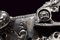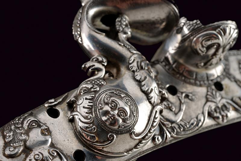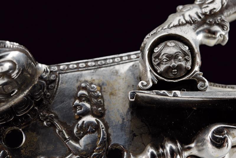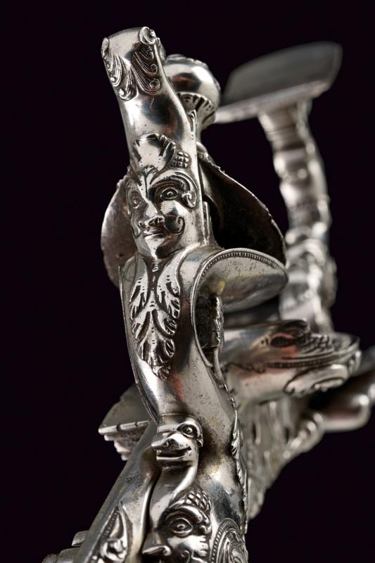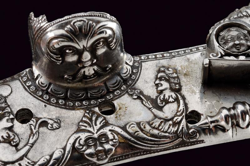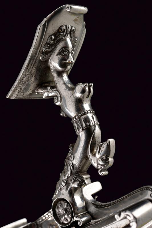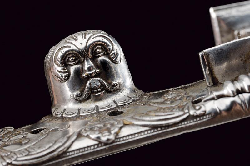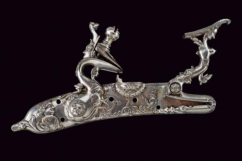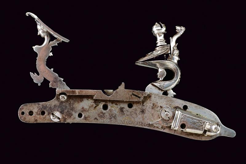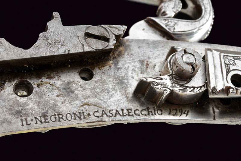 Bellissima batteria a pietra alla fiorentina de 'Il Negroni' a Casalecchio, datazione: 1794 provenienza: Bologna, Cartella leggermente tondeggiante e di forma incurvata finemente decorata a maschere grottesche in rilievo e serpenti, il cane sempre lavorato in rilievo e con vari elementi a traforo a mascheroni e teste di serpente. Intagliati e incisi anche la ganascia superiore e il retro del cane. Il fondo dello scodellino tutto intagliato. Il copriscodellino e parte della meccanica posteriore mancanti. La martellina finemente scolpita e traforata en suite, il collo lavorato a protome grottesca. Anche le teste delle viti a mascherone. Il retro con firma e data: 'IL NEGRONI . CASALECCHIO 1794'. Le parti rimanenti della meccanica incise a foglie e a testa di drago. Elegante opera, di altissima qualità, realizzata su ordine di questo esponente della stirpe dei Negroni, famiglia di archibugiari di Brento, nel bolognese.Francesco Negroni di Casalecchio (II) azzaliniere e archibugiaro, ultimo decennio del XVIII e primo quarto del XIX secolo. Vedi 'Repertorio Storico degli Archibugiari Italiani', di B. Barbiroli, pag. 392 e pagg. 742-745.Vedi due esemplari simili per qualità e decorazione in 'Armi da Fuoco Italiane' di Gaibi, nr. 577 e 578 (il primo con firma Il Negroni, conservato al Museo di Palazzo Venezia). lunghezza plate 15,1 cm.