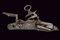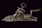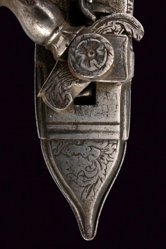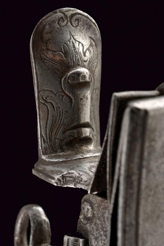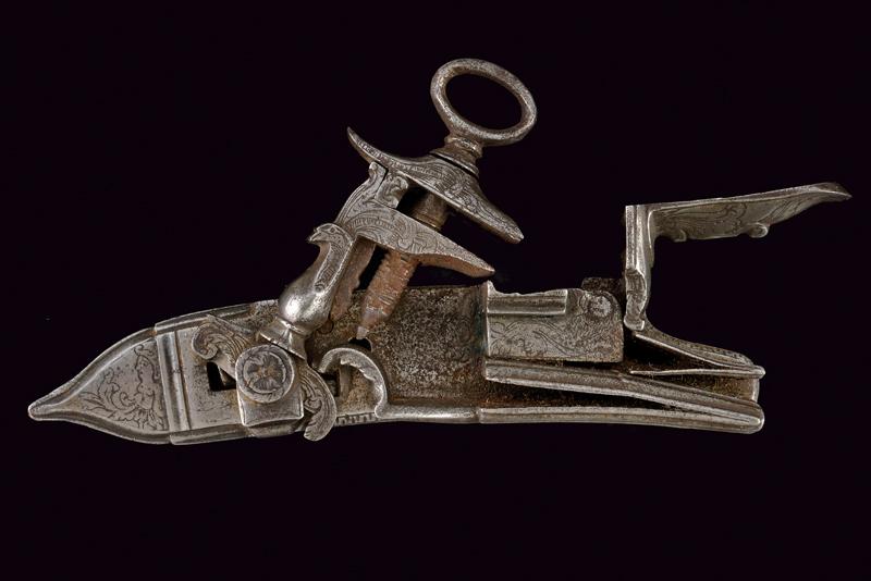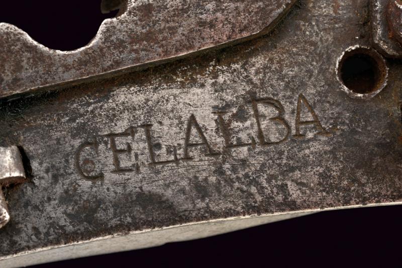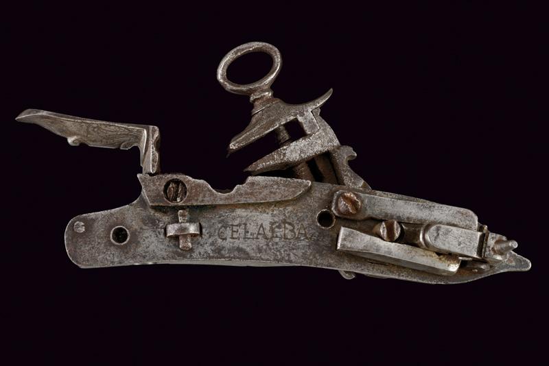 Batteria a pietra alla romana, datazione: XVIII Secolo provenienza: Celalba, Cartella piatta con margini e codetta ribassati, la codetta anche con figura grottesca incisa. Il cane con varie incisioni a foglie, come anche lo scodellino e il dorso della martellina. Sul retro la marcatura 'CELALBA'. Celalba è una frazione del Comune di San Giustino (PG), fu sede per circa quattrocento anni della Repubblica di Cospaia, un piccolissimo stato cuscinetto fra le terre dei Medici e quelle del Papato. Ebbe una fiorente produzione di tabacco e altrettanto fiorenti produzione e commercio di armi da fuoco. Vedi 'Repertorio Storico degli Archibugiari Italiani' di Bruno Barbirolo, pagg. 583-584. lunghezza plate 13,8 cm.