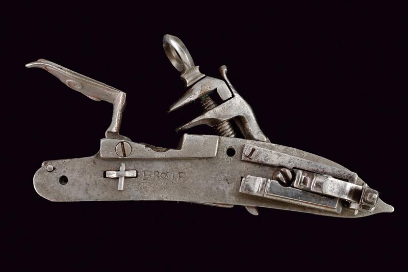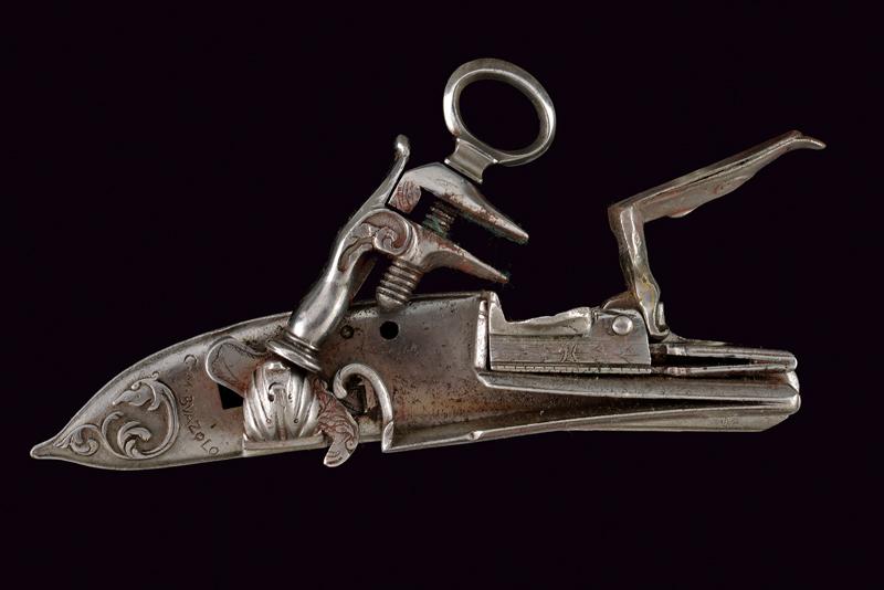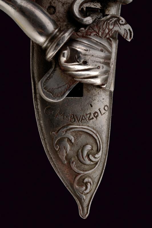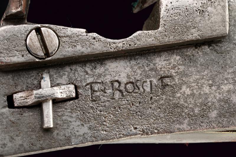 Batteria a pietra alla romana con firme, datazione: XVIII Secolo provenienza: Italia centrale, Cartella leggermente tondeggiante con margine a lista ribassata, figura grottesca in rilievo alla codetta e firma 'G.M. BUAZOLO'. Il cane con base intagliata a foglie, collo a balaustro e racemi in rilievo. Il retro con firma 'F. ROSSI F.' lunghezza plate 14,7 cm.