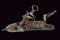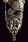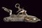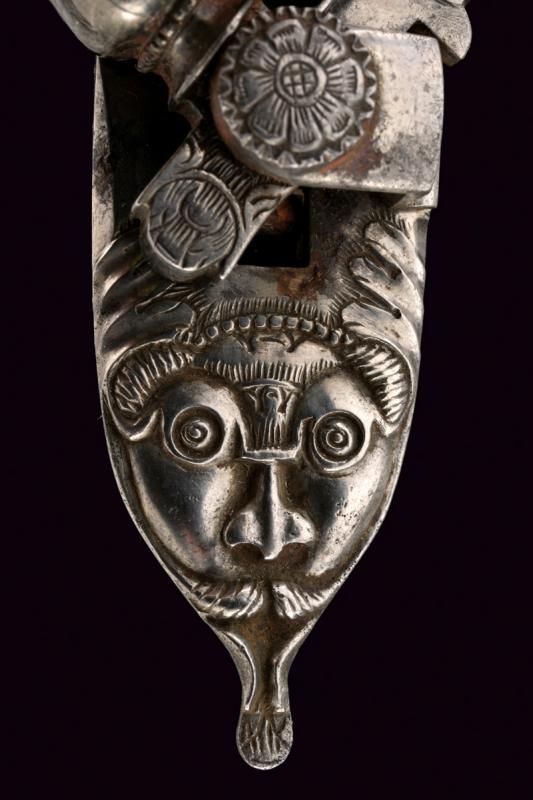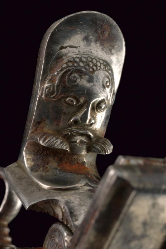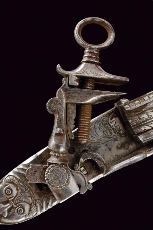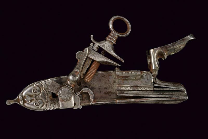Bella batteria a pietra alla romana con mascheroni, datazione: XVIII Secolo provenienza: Italia centrale, Cartella piatta a bordi scantonati con volto grottesco baffuto finemente intagliato alla codetta, al centro della piastra incisioni a racemi su fondo a trattini. Il cane con collo a balaustro, dotato di perno con copertura ornata con intaglio a rosetta e con incisioni anche sulle ganasce. Qualche piccola intaccatura. Il dorso della martellina con bel mascherone. Lo scodellino con incisioni a racemi e cornici modanate, la molla lavorata en suite. lunghezza plate 14,2 cm.