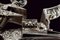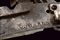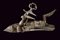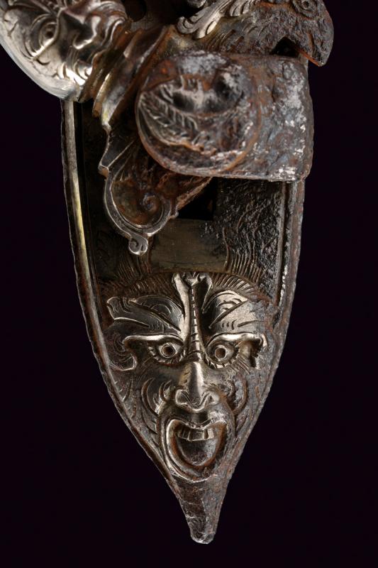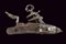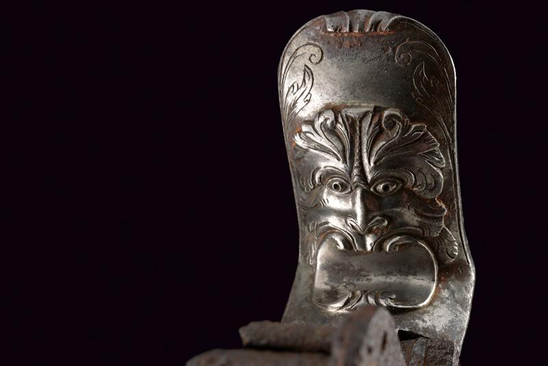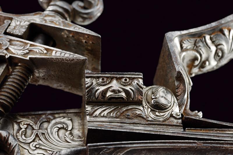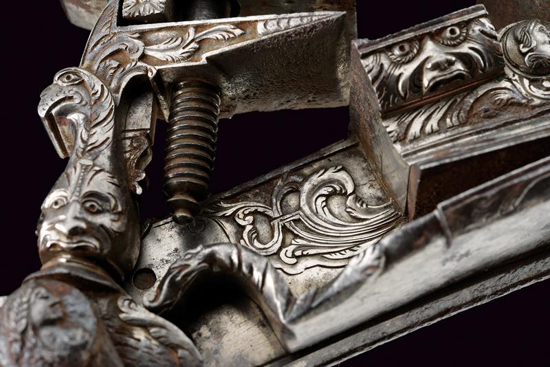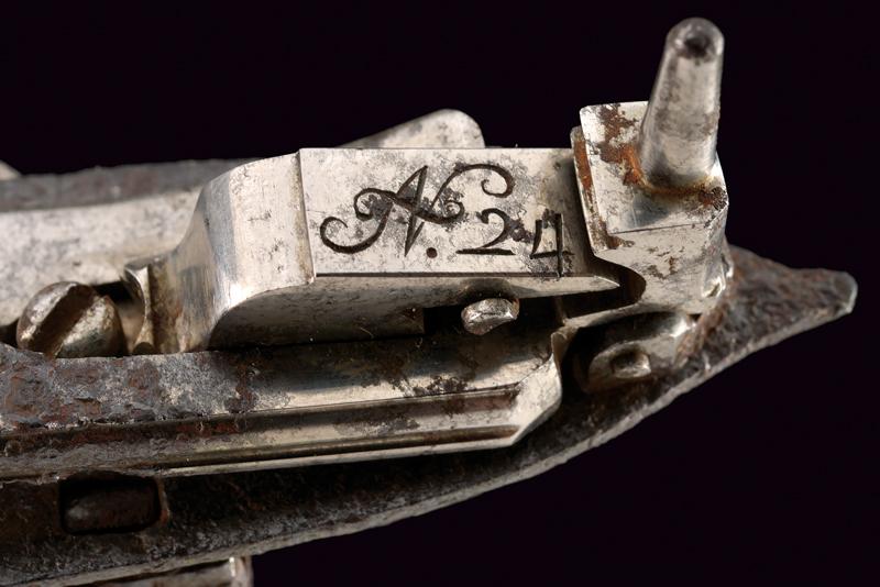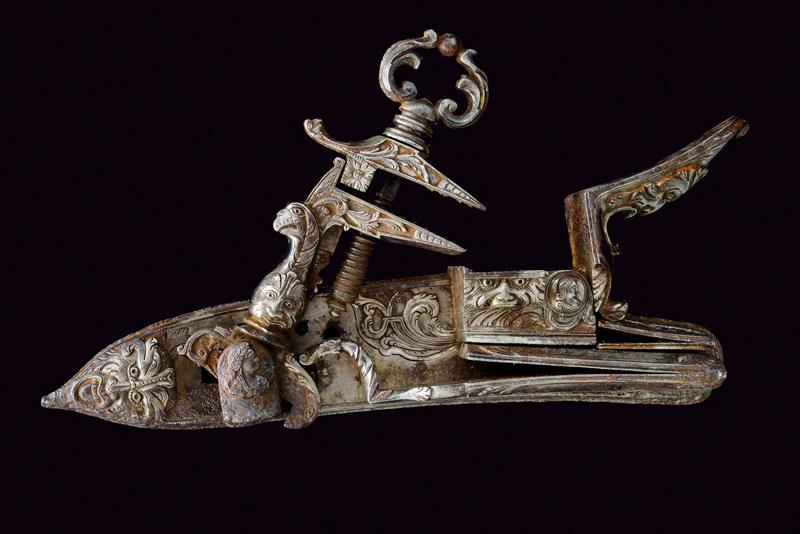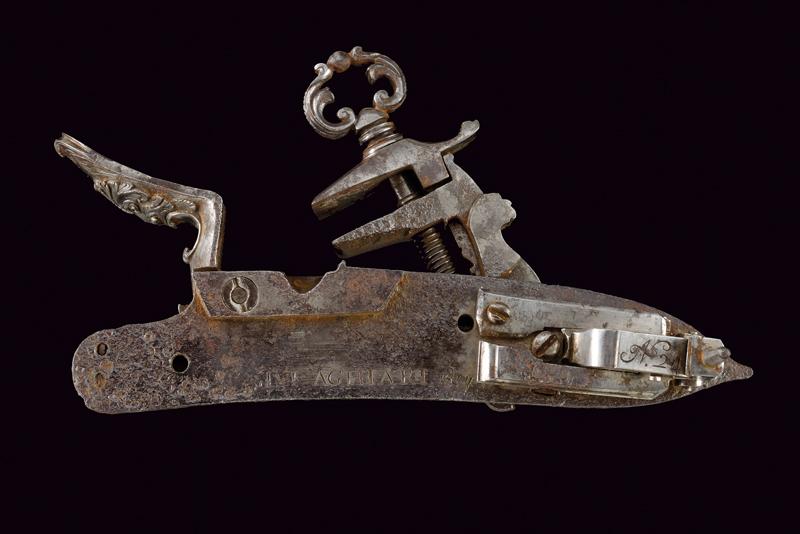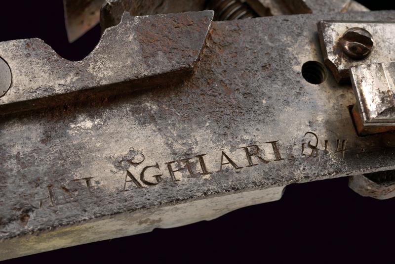 Elegante batteria a pietra alla romana con resti di firma, datazione: 1814 provenienza: Anghiari, Cartella piatta con margine a lista ribassata recante alla codetta bel mascherone in rilievo. Il cane tutto intagliato sul lato anteriore, con grottesche al collo e racemi alle ganasce. La vite del morsetto con bel traforo a foglie. La base con resti di un volto. La molla esterna intagliata a serpente, lo scodellino con mascherone, un altro bel volto grottesco in rilievo sul dorso della martellina. Alcune aree con forti intaccature. Il retro recante resti di firma: probabilmente '...ANI' o '...INI' e la dicitura ben visibile 'ANGHIARI' con l'anno '1814'. La meccanica marcata 'N. 24' Notevole acciarino con decori di gran qualità. lunghezza plate 14,6 cm.