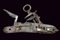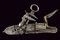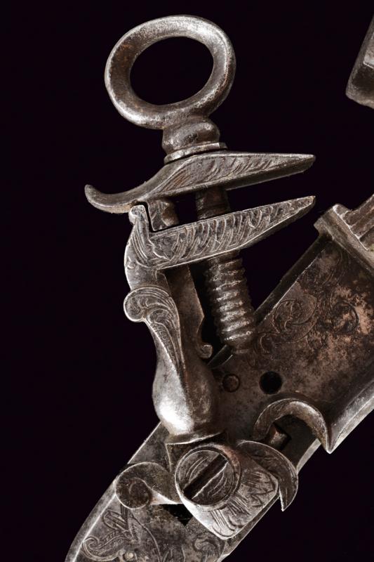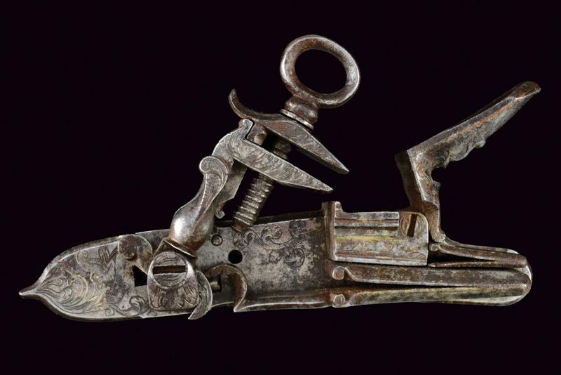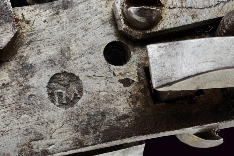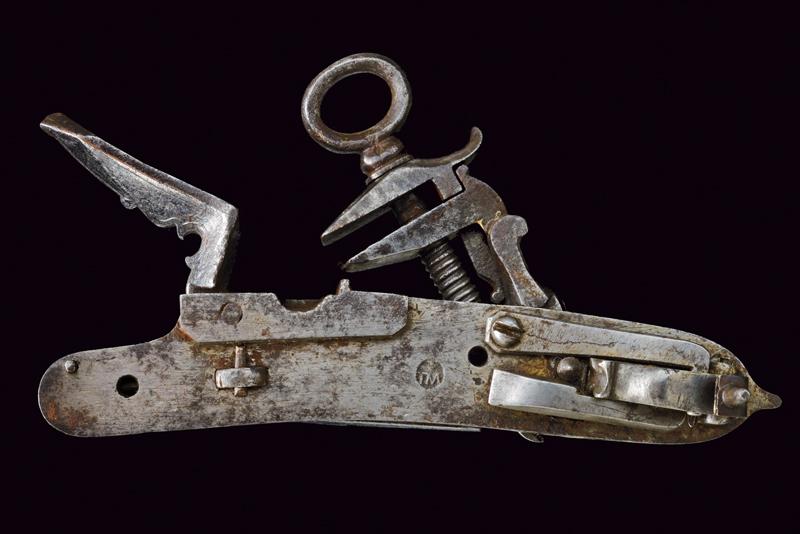 Batteria a pietra alla romana con punzone, datazione: XVIII Secolo provenienza: Italia centrale, Cartella piatta incisa a motivi floreali e grottesche, cane lavorato en suite, scodellino modanato, all'interno marca 'TM' sotto una corona o una stella (non chiaramente visibile). Barbiroli (in 'Marchi e Firme di Archibugiari Italiani', pag. 156) riporta un marchio TM, cit: 'sotto una stellina (?) in un cerchio', sull'interno della batteria di un fucile alla romana, 1730 circa, nella collezione Albicini. lunghezza 14.7 cm.