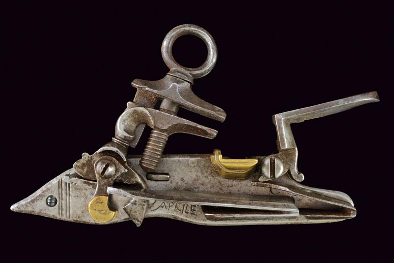 Batteria alla micheletta a pietra focaia firmata 'APRILE', datazione: 1800 circa provenienza: Italia, Cartella piatta con scanalature verticali alla codetta, scodellino e briglia del cane in ottone. Sotto alla molla la firma 'APRILE'. lunghezza plate 15 cm.