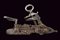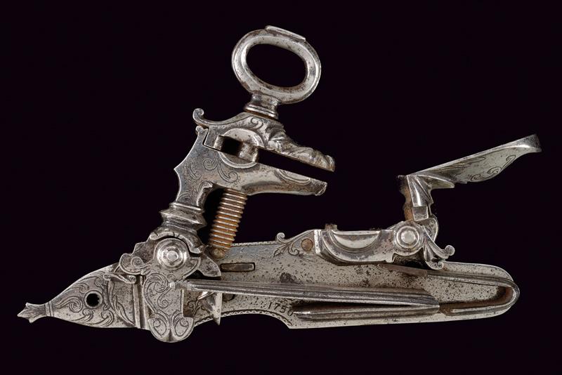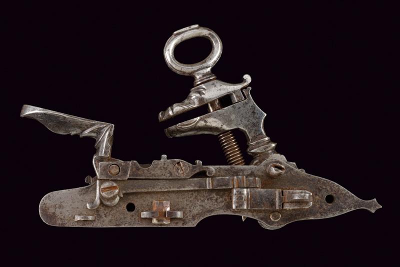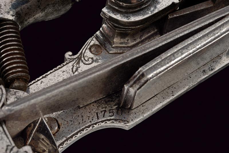 Batteria a pietra alla micheletta datata, datazione: 1750 provenienza: Italia o Spagna, Cartella piatta con codetta allungata e incisa a volute. Il bordo parzialmente ornato a cornicette, nella parte inferiore la data '1750'. La briglia incisa a volute. Il collo del cane con anellature e incisioni a volute e rocaille. Le ganasce vagamente intagliate a testa di cane. Dorso della martellina con incisioni a fiori. Le molle modanate. lunghezza plate 14,8 cm.