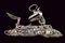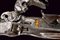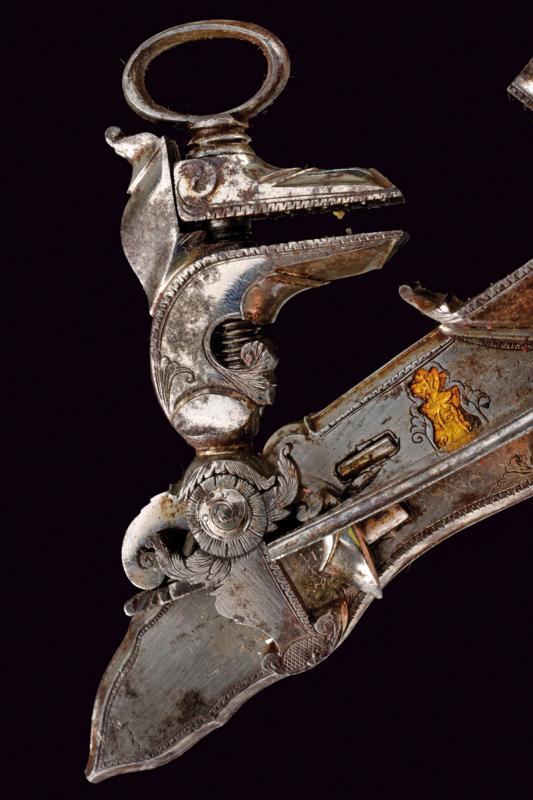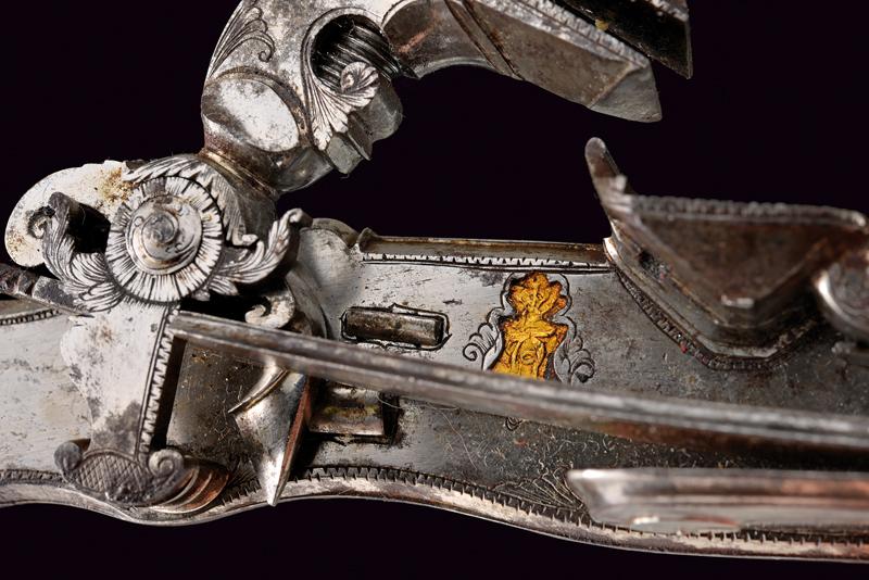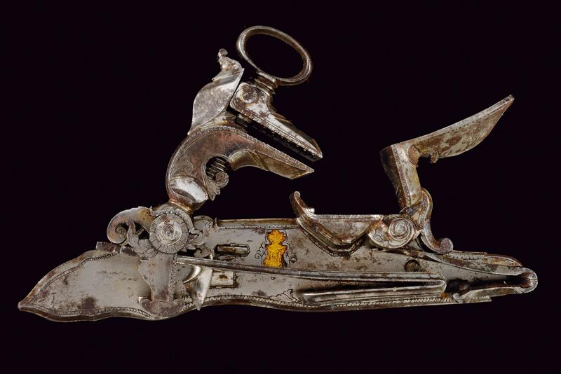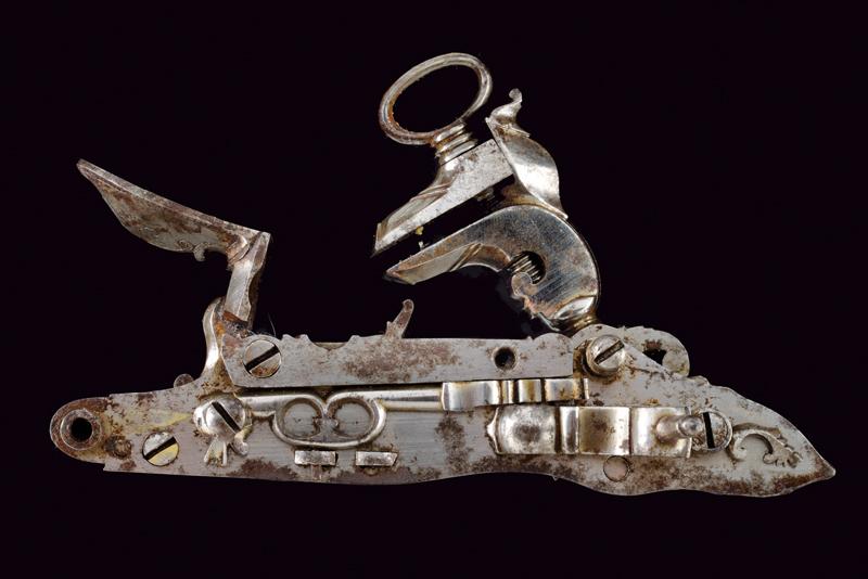 Elegante batteria a pietra alla micheletta, datazione: Seconda metà del XVIII secolo provenienza: Italia o Spagna, Cartella piatta con bordi a taglio obliquo e sottile margine a lista ribassata, la superficie percorsa da una cornicetta geometrica e con un piccolo fiorame alla codetta. La briglia del cane finemente lavorata ad incisione e ad intaglio ai bordi a effigiare foglie. Il cane con cornicette che riprendono la cartella, piccole incisioni floreali e spigolature alle ganasce. Scodellino e martellina sempre con cornicette e piccole incisioni. Riccioli in rilievo. Qualche piccola intaccatura, il resto delle superfici molto ben conservato. Al centro della piastra una marca in oro con monogramma coronato. lunghezza plate 14,3 cm.