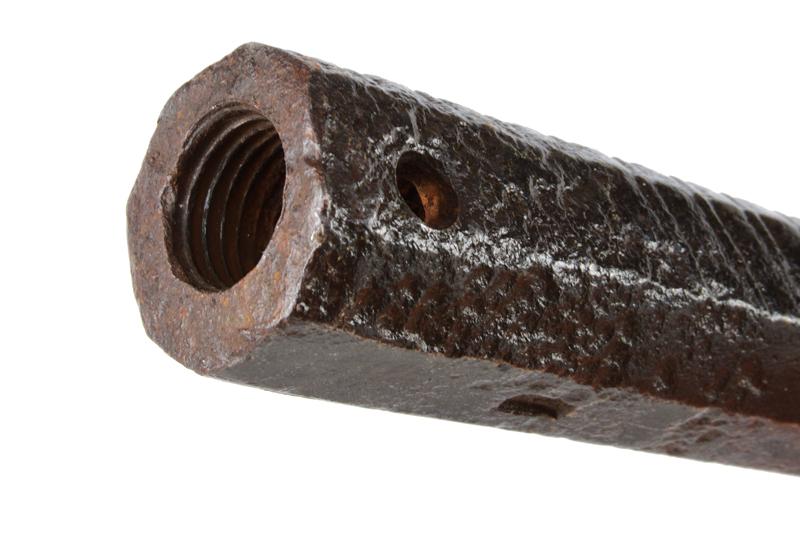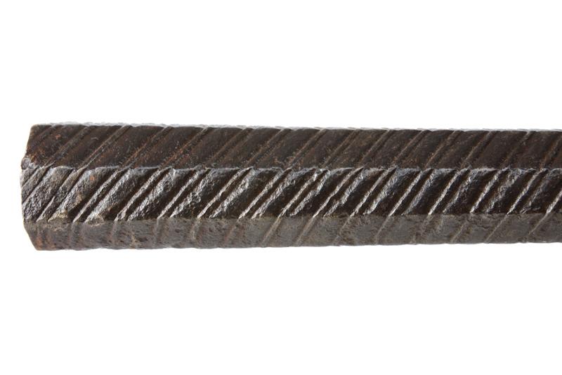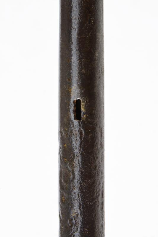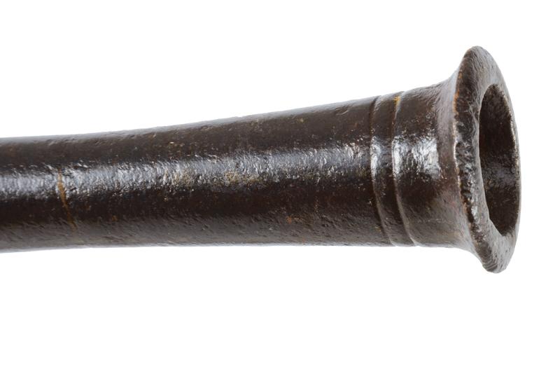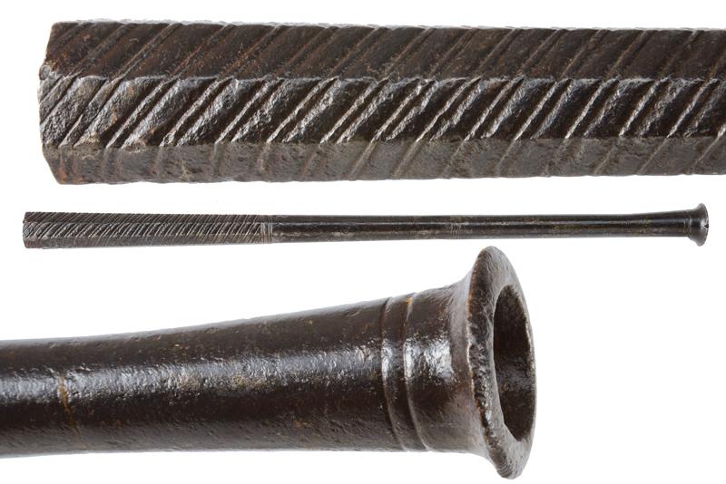 Canna da schioppo, datazione: XVI - XIX Secolo provenienza: Italia, Di tipo arcaico, a tre ordini. Il primo segmento ottagonale decorato ad intaglio a scanalature trasversali e oblique. La culatta mancante, un foro praticato forse in epoca successiva per conversione a luminello. Nella parte inferiore un piccolo passante. Anellature al cambio. Il segmento centrale ottagonale e liscio. L'ultimo tondo con anellature anche al secondo cambio, sforatura rettangolare nella parte inferiore e prolungamento realizzato in tempi antichi. La volata strombata e con spesso margine volto verso l'esterno. lunghezza 60,8 cm.