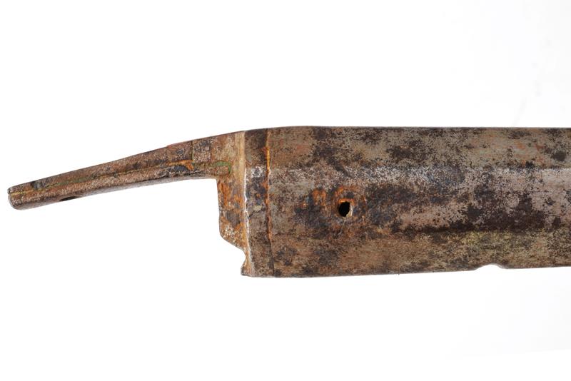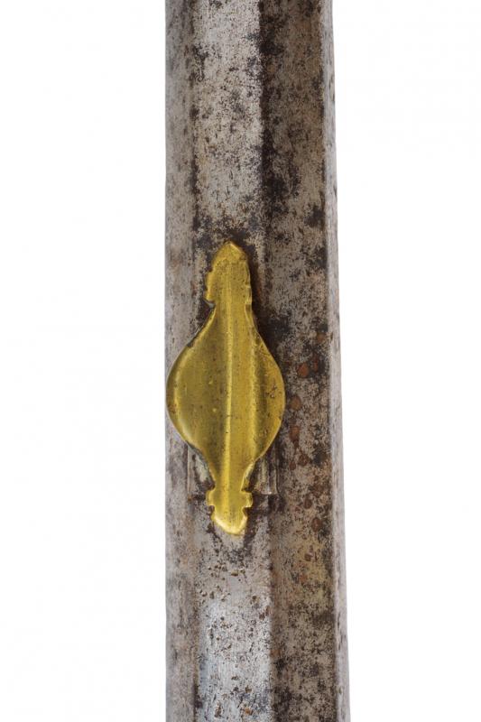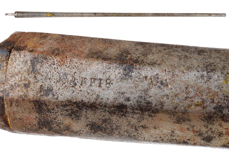 Canna per fucile a pietra marcata Caffi, datazione: 1700 circa provenienza: Brescia, A due ordini, ottagonale e tonda con resti di anellatura al cambio, mirino e traguardo a sella in ottone. Un reggibacchetta sempre in ottone. Al dorso vicino alla base la marcatura 'CAFFI' sormontata da corona. Barbiroli riporta che i Caffi furono una famiglia bresciana di mercanti d'armi attiva dal 1450 al 1700, sono presenti anche alcuni archibugiari con lo stesso cognome, prevalentemente nel XVII secolo. Vedi 'Repertorio Storico degli Archibugiari Italiani', pagg. 145-146. lunghezza 113,5 cm.