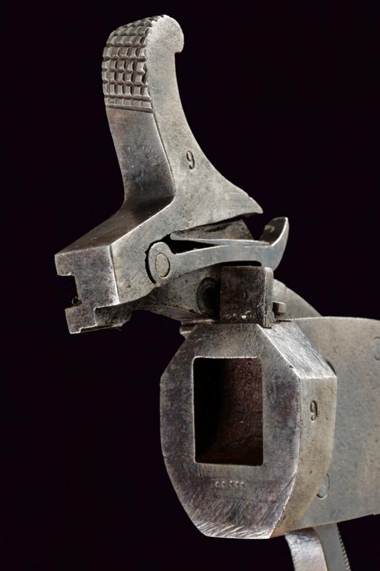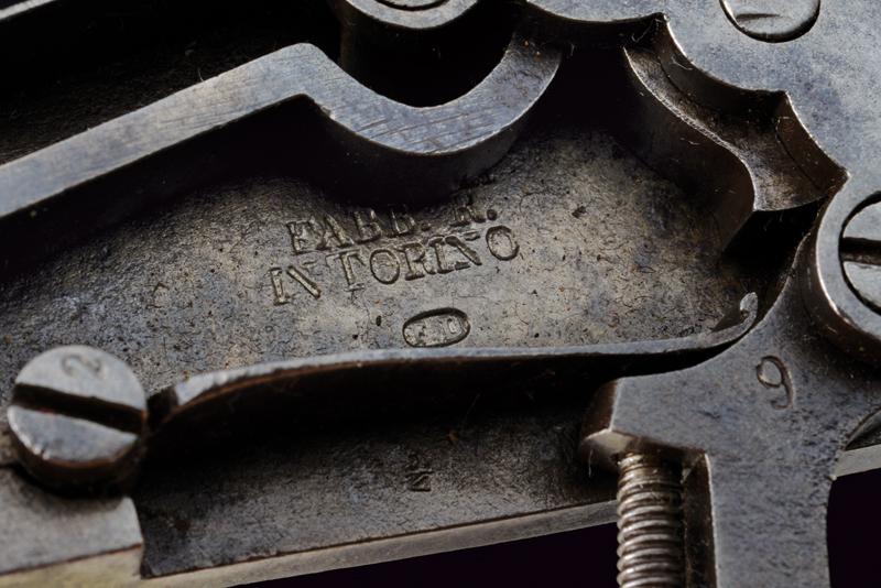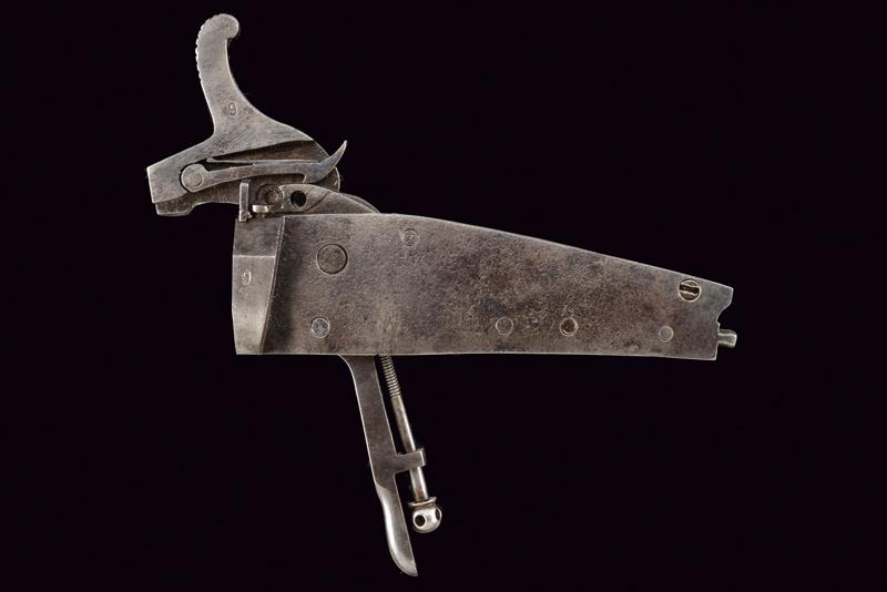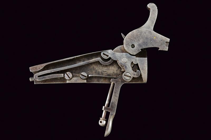 Interessante meccanismo di scatto, datazione: XIX Secolo provenienza: Torino, Gruppo di scatto composto da una piastra in ferro sulla quale sono montati i vari componenti. Completa di cane zigrinato e di tutte le molle. Il lungo grilletto con un elemento avvitato. All'interno la marcatura 'FABB.A R.A. IN TORINO' e il punzone 'FD'. Intaccature. Funzionante. Probabilmente un elemento sperimentale. lunghezza 14,5 cm.