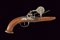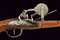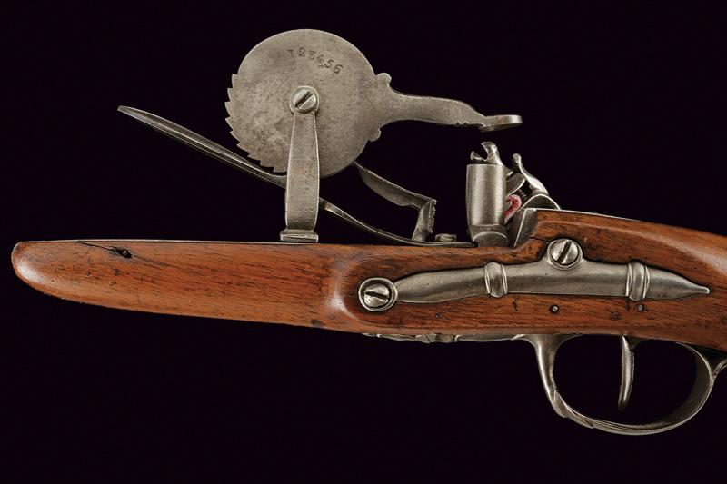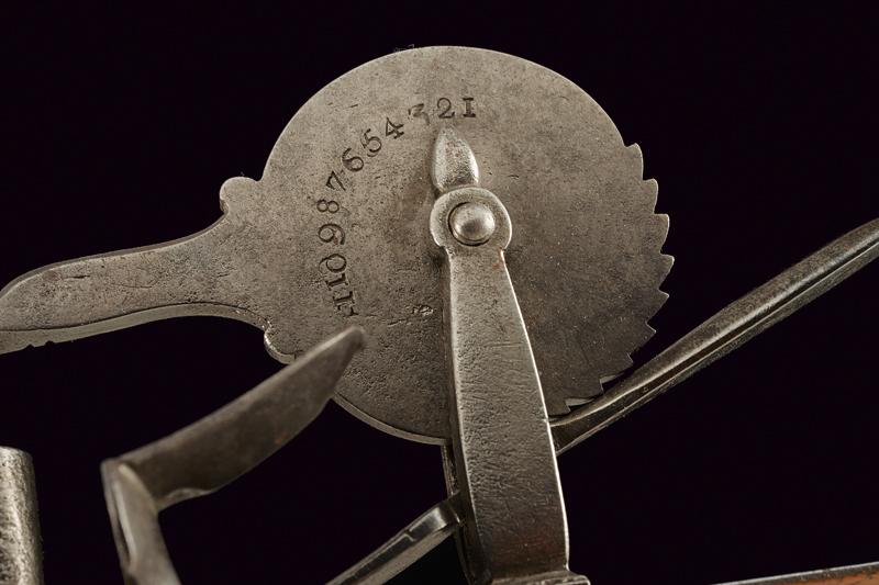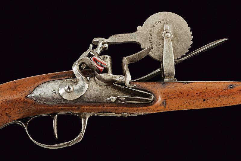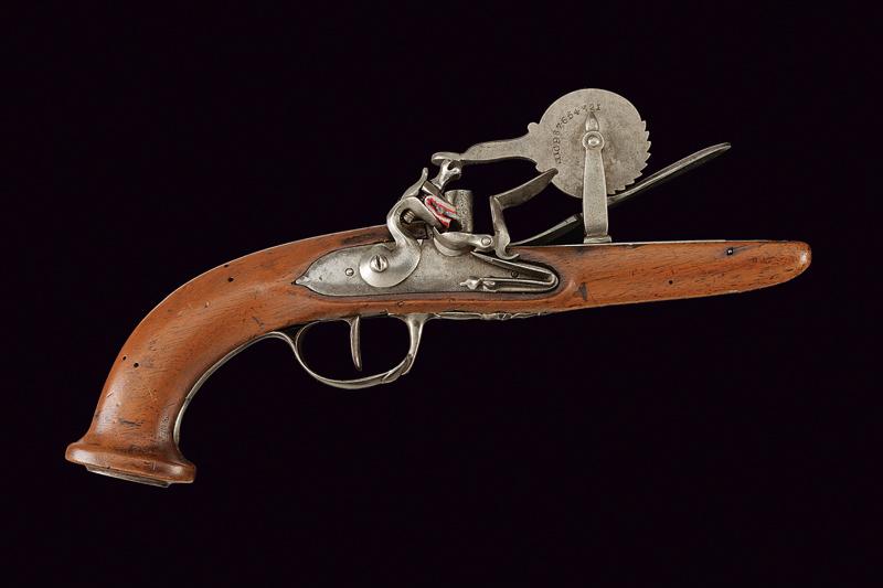 Provapolvere a pietra focaia, datazione: 1800 circa provenienza: Europa, Cassa liscia in legno (qualche foro di tarlo). Batteria a pietra funzionante. Ponticello e coccia in ferro. La ruota di misurazione dentata e numerata su entrambi i lati; la sua molla munita di leva di sgancio. Raro. lunghezza 26 cm.