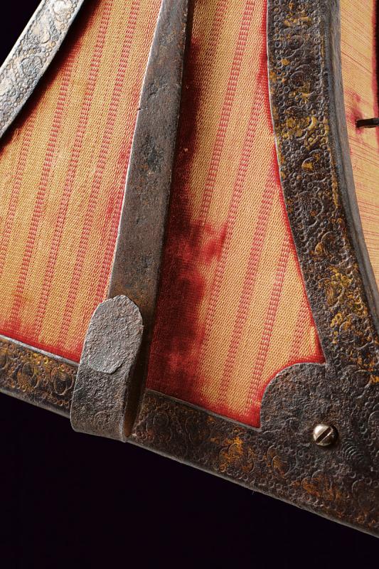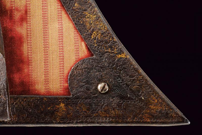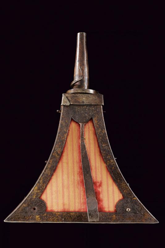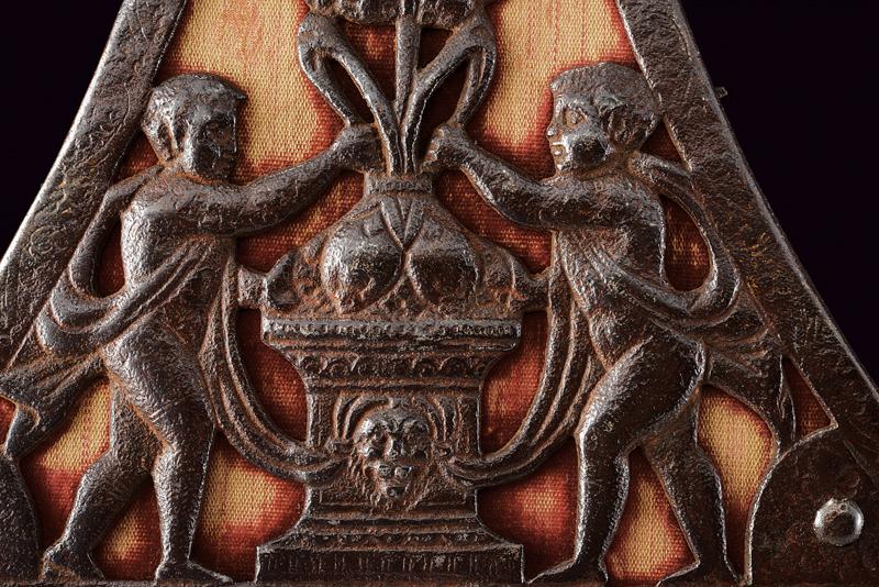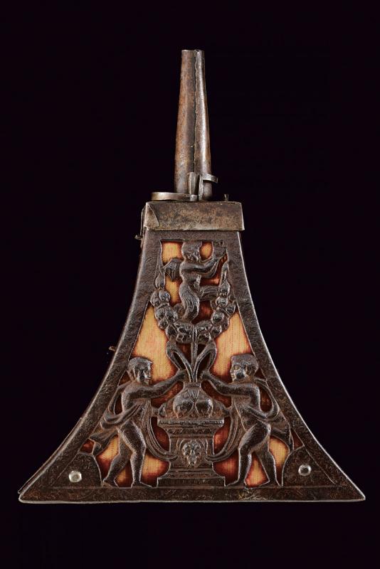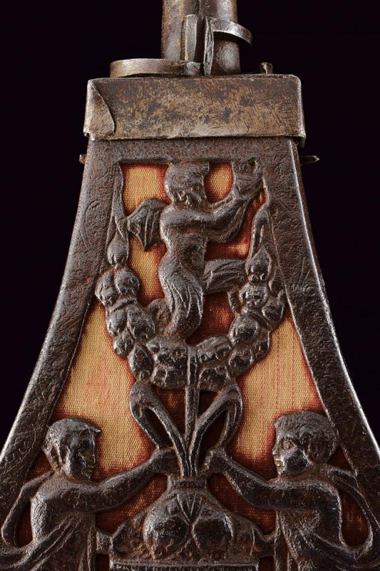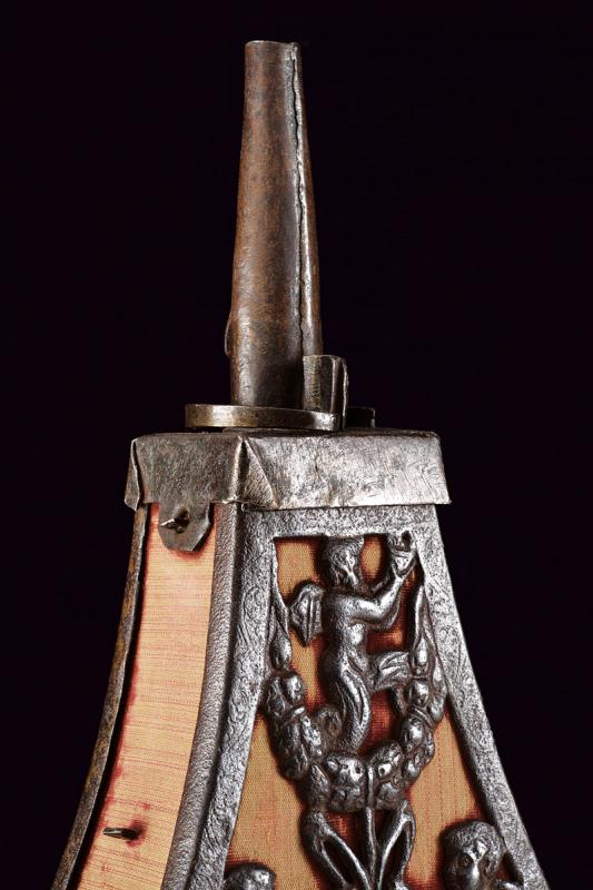 Fiasca da polvere di moschettiere , datazione: 1620 circa provenienza: Italia, Di forma trapezoidale, in legno, ricoperta di velluto rosso (quasi completamente liso nelle parti visibili) con bellissimi fornimenti in ferro sbalzato. La faccia anteriore recante putti attorno ad un piedistallo decorato con una testa di leone una ghirlanda; le bande ai bordi incise e con resti di doratura nella parte posteriore (una vite mancante). Cannello con dosatore, sul lato posteriore un gancio da cintura. Quattro anelli di sospensione. Rara. altezza 30 cm.