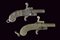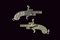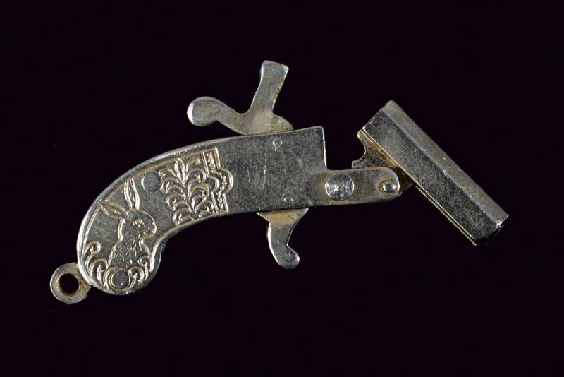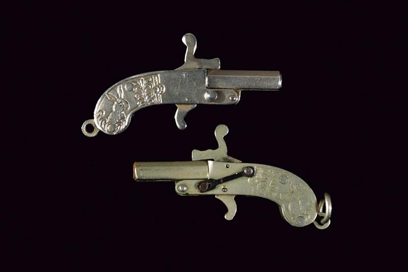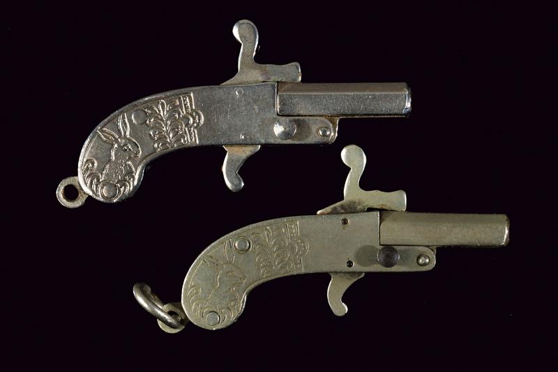Paio di pistole a spillo in miniatura, datazione: XX Sec. provenienza: Europa, In metallo, con meccanica funzionante e canna basculante. I fianchi del calcio incisi, con effige di una lepre e di un cervo. Grilletto a sprone. lunghezza 3.8 cm.