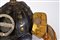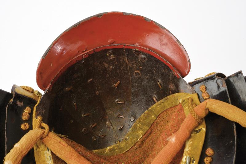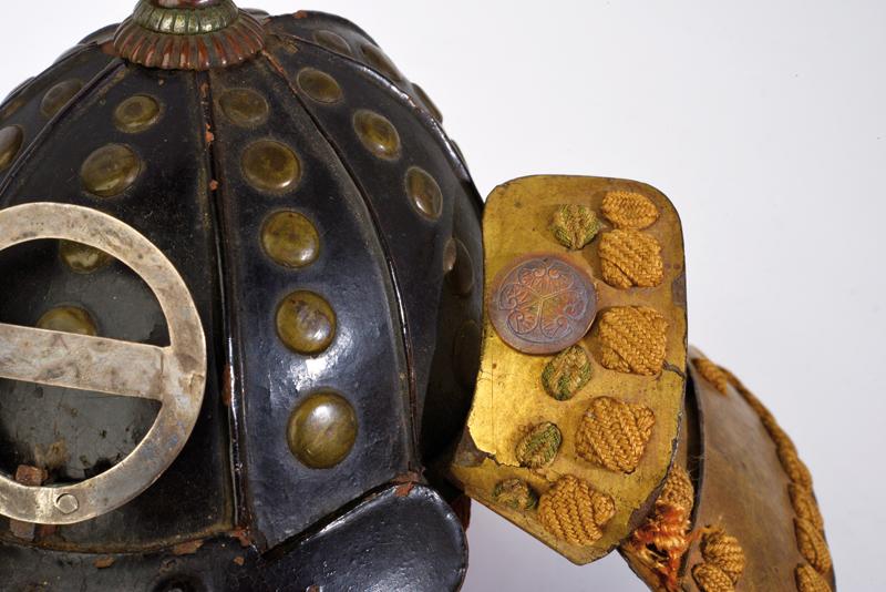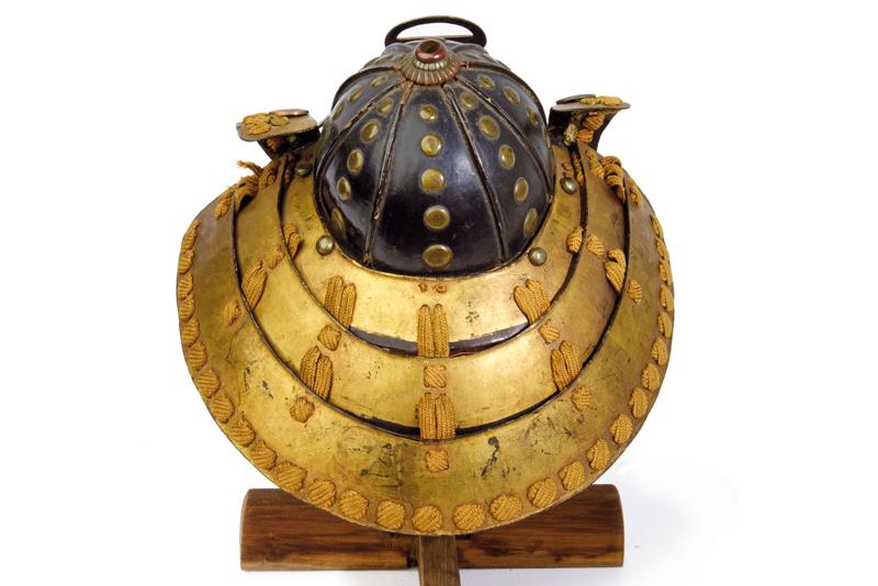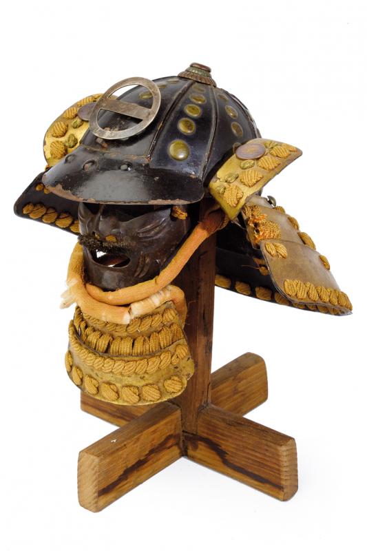 Raro ed elegante modello di Kabuto completo di menpo, datazione: Periodo Edo (1603-1867) provenienza: Giappone, Hoshi-bachi kabuto in acciaio a 8 piastre a lacca nera, shikoro a tre lame in lacca oro con allacciature in stile sugake, fukigaeshi con Mon Tokugawa, maedate in argento. Bel ressei menpo in acciaio completo di yodarekake in lacca oro. Completo di supporto in legno. Si tratta di un raro modello ferro in tutto simile agli originali, prodotto da un maestro armaiolo durante il periodo Edo (1850 circa) altezza 22 cm.