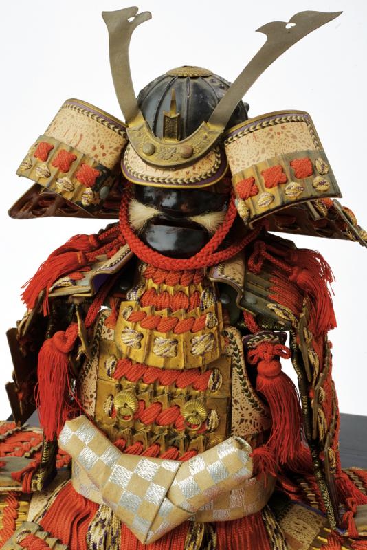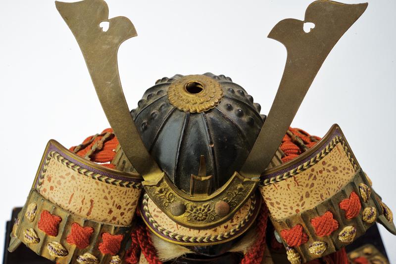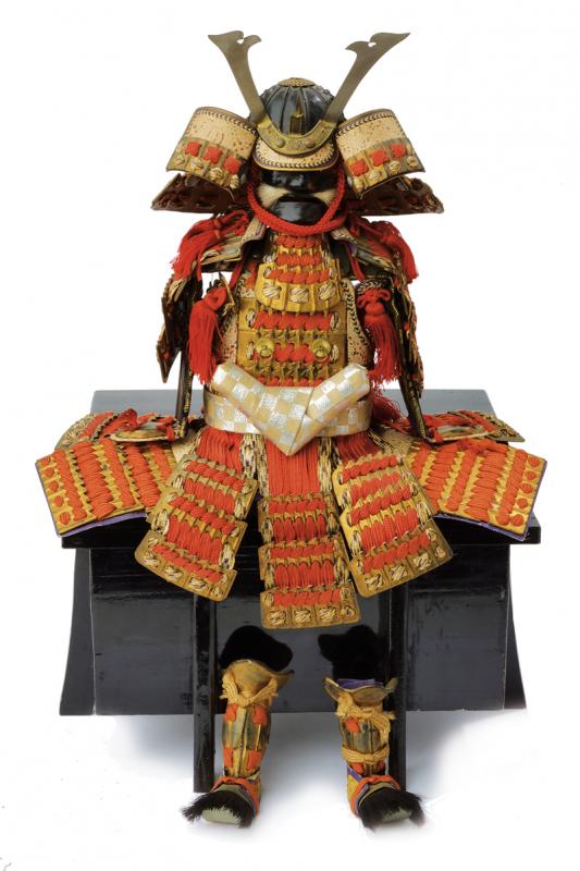 Bel modello di Yoroi, datazione: 1900 circa provenienza: Giappone, In metallo e tessuto. Completa di gusoku bitsu (difetti e mancanze). Il kabuto completo di menpo. altezza circa 48 cm.