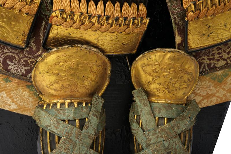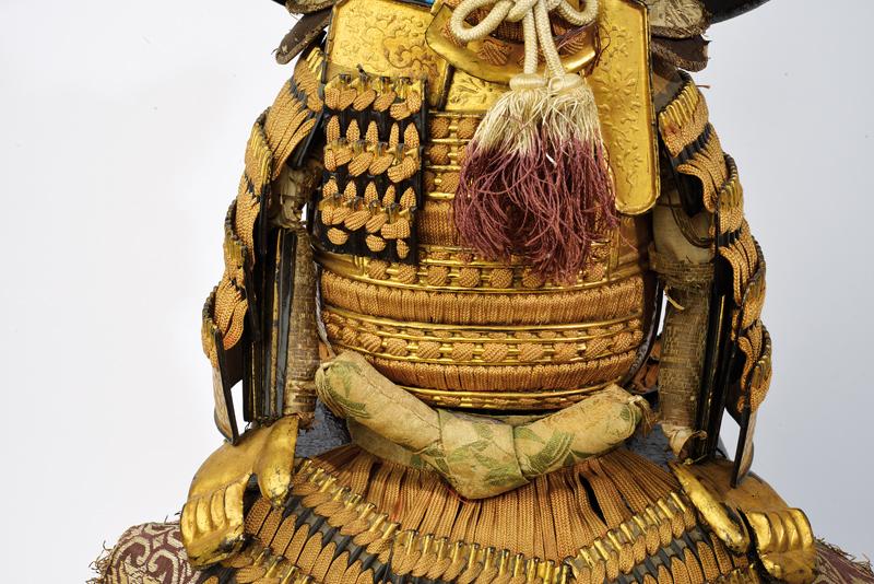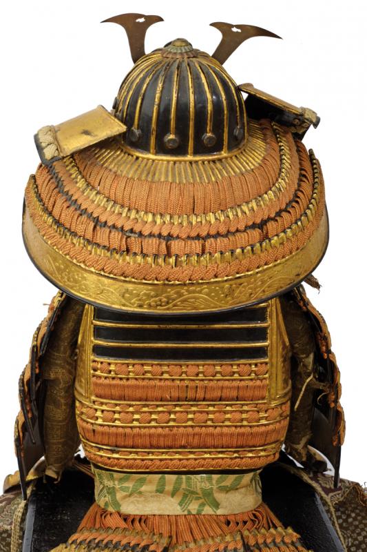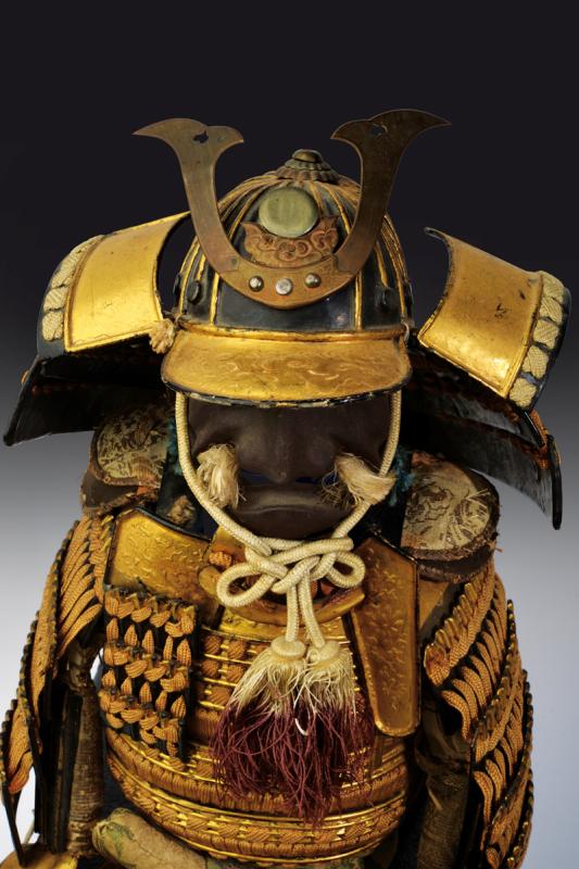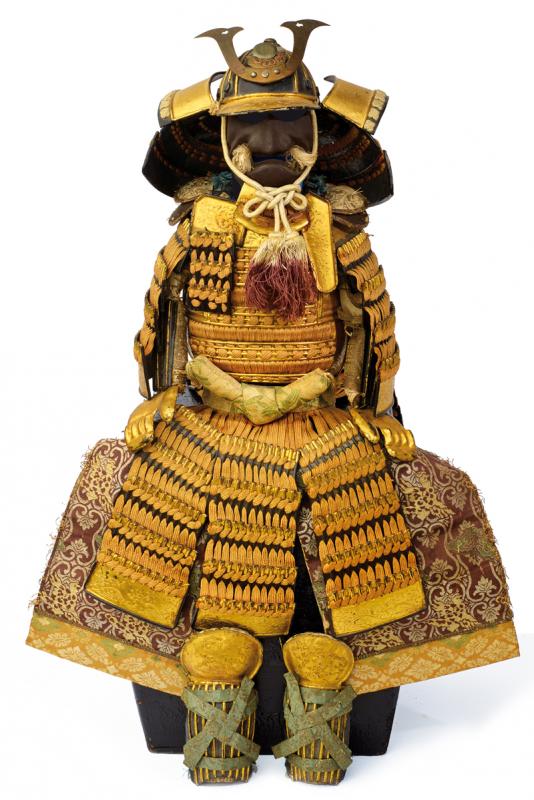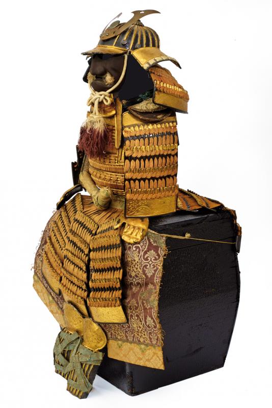 Modello di Yoroi, datazione: Periodo Meiji (1868-1912) provenienza: Giappone, Di buona qualità, in lacca oro, completa di cassa originale in legno. altezza 70 cm.