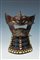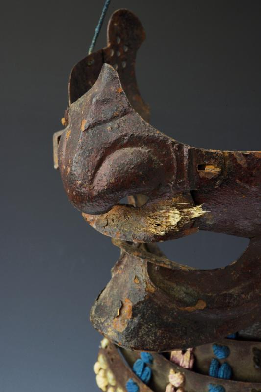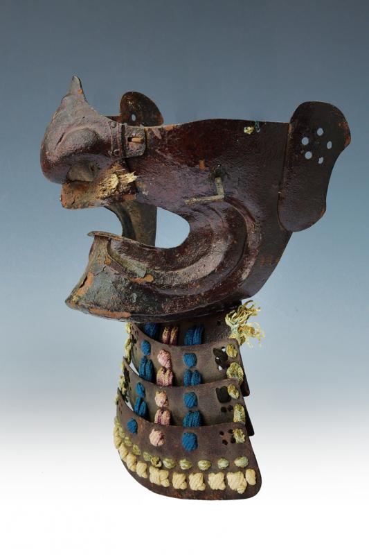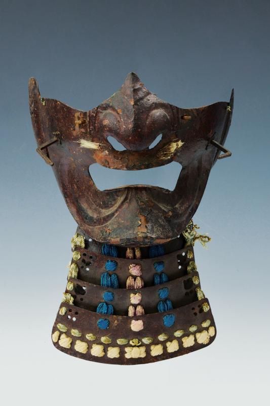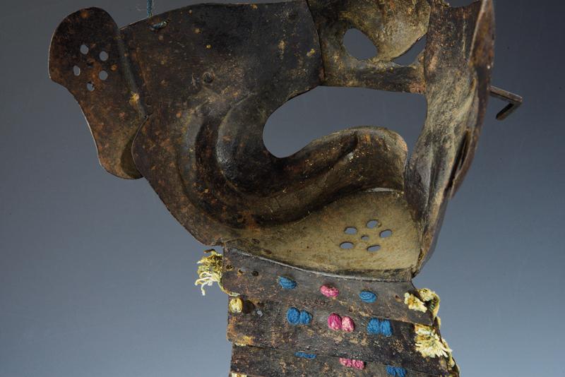 Ressei menpo, datazione: Periodo Edo (1603-1867) provenienza: Giappone, In acciaio a lacca marrone, naso amovibile, yodarekake a tre lame allacciate in stile sugake. Mustacchi mancanti, danni alla lacca ed alle allacciature dimensioni 23 x 18 cm.