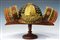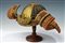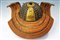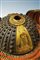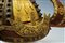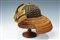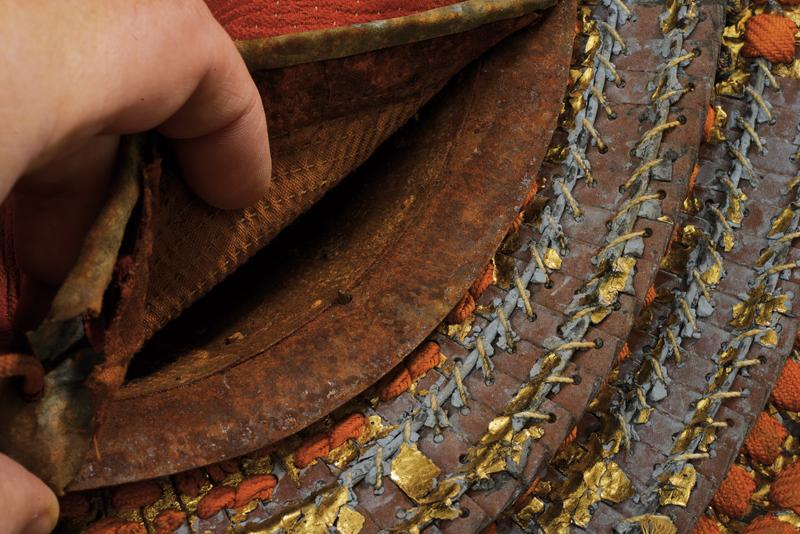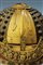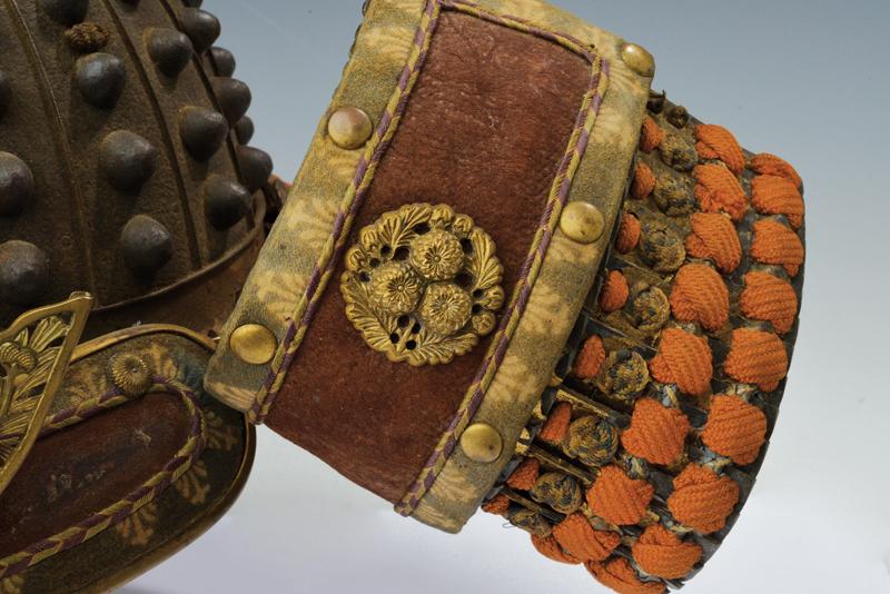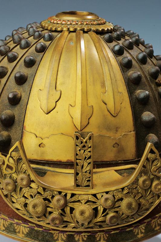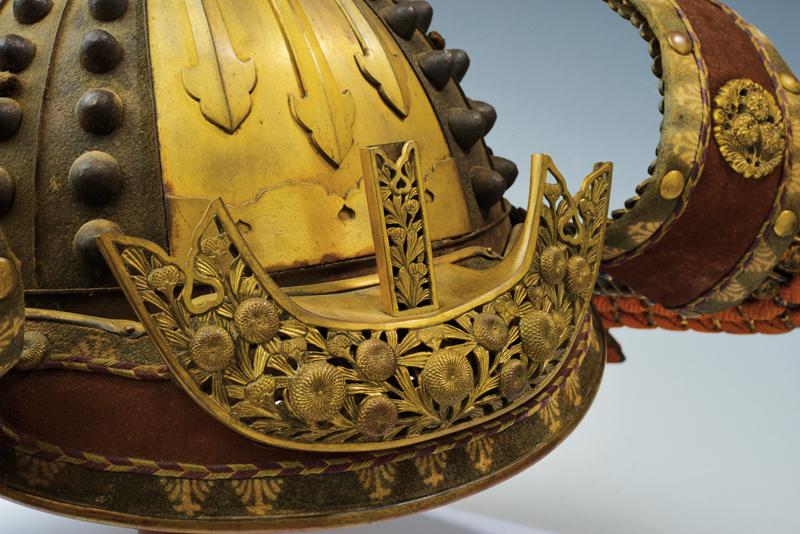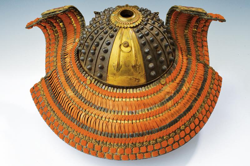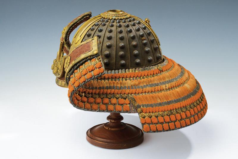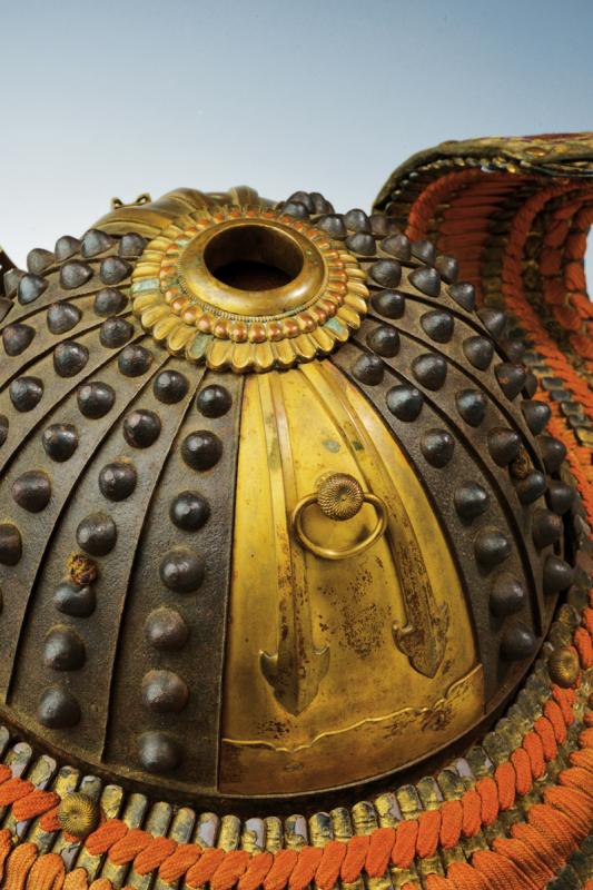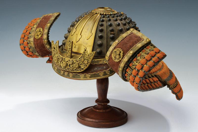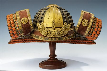 Hoshi bachi kabuto, datazione: Periodo Edo (1603-1867) provenienza: Giappone, Hachi in ferro a 16 piastre rivettate e chiodate, grande tehen kanamono in rame dorato a settori, mabizashi rivestito in pelle, kuwakatada dorato traforato a fiorame, grandi fukigaeshi con Mon dorati, ampio shikoro a tre lame allacciato in seta arancione. 1800 circa. altezza 20 cm.