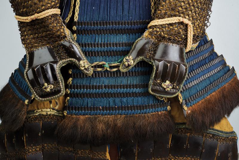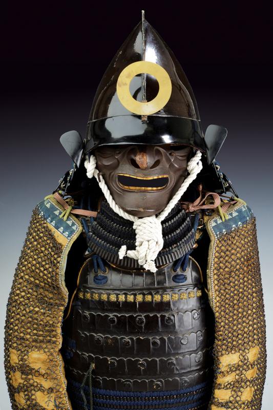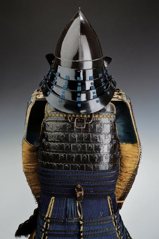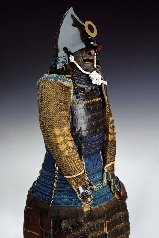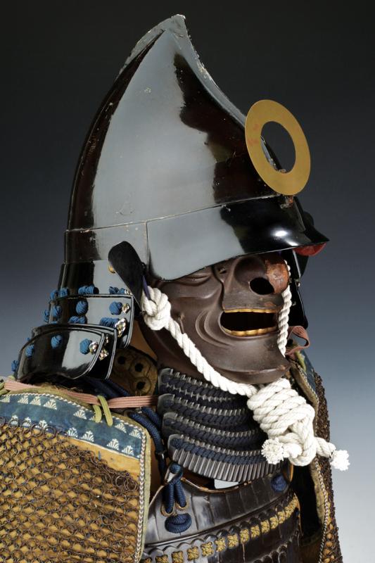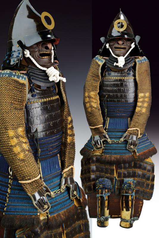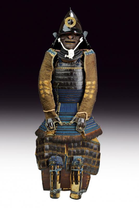 Iyozane Hishi-yoji do gusoku (Armatura da Samurai), datazione: Periodo Edo (1603-1867) provenienza: Giappone, Momonari Kabuto in ferro laccato nero, Shikoro (più recente) a quattro lame allacciate in Kon-ito Sugake Odoshi. Fregio frontale Ja-no-me Mon. Ressei menpo in lacca marrone di buona fattura con Yodarekake a quattro lame allacciate in Kon-ito kebiki odoshi; naso staccabile. Ni-mai Do con piastre allacciate in cuoio, gli Hishi-toji visibili. Con kusazuri a cinque lame di cui l'ultima con bordo in pelliccia. Kote in maglia di ferro, Sode mancanti, Haidate a lamelle in lacca nera come pure i suneate. Probabilmente composita. Allacciature in seta blu. Completa della cassa di trasporto in legno. Epoca: tardo XVIII secolo. altezza 150 cm.