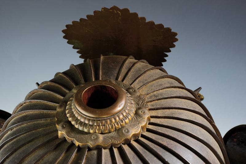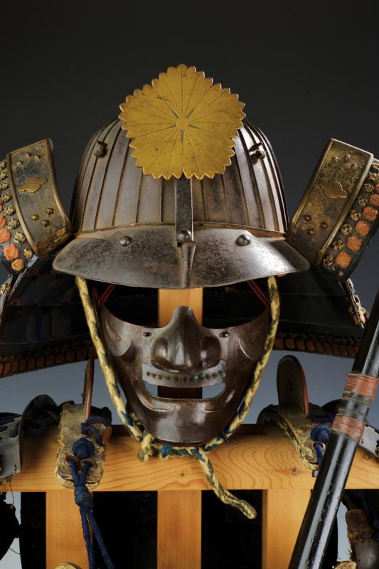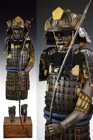 Mogami do Tosei Gosoku da arciere (Armatura da Samurai), datazione: Periodo Edo (1603-1867) provenienza: Giappone, Suji kabuto in ferro a 32 piastre con Tehen dorato e Mabezashi con Maedate in rame dorato, Ko Manju Shikoro a 4 lame allacciate in Kon-ito Sugake Odoshi, grandi Fuchigaeshi con Mon. Menpo in ferro (mustacchi mancanti) privo di Yodarekake.Ni mai Do in ferro di buona qualità a lame orizzontali articolate, Sode a lacca bruna, Kote destro mancante (per l'utilizzo dello Yumi), Kusazuri in ferro, Haidate e suneate in lacca nera (non pertinenti). Completa di Yumi. Piccole mancanze e danni. Manichino incluso. Si tratta di una armatura di buona qualità risalente al medio periodo Edo, utilizzata in modo più agevole rinunciando ad il Kote destro. altezza total with bow 210 cm.