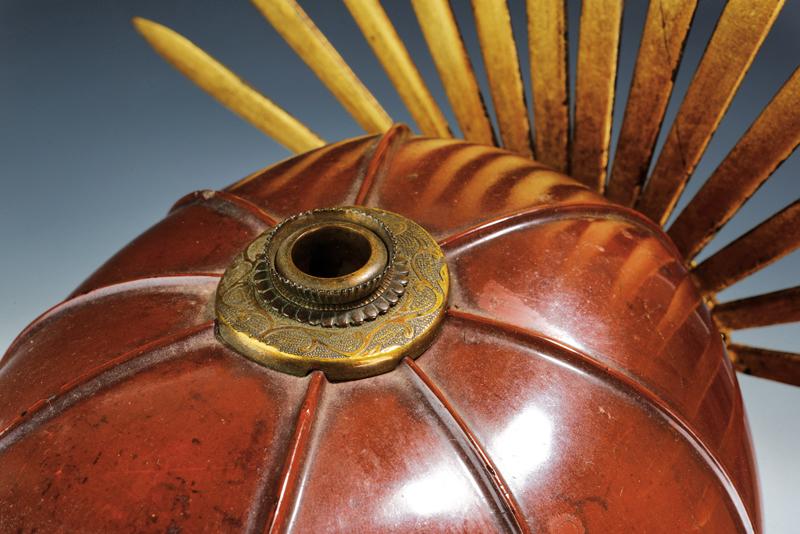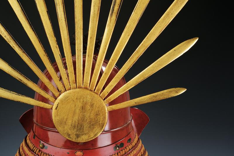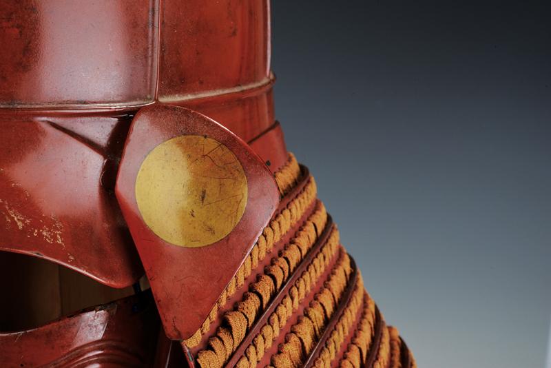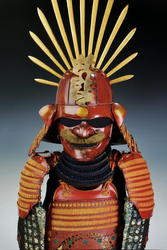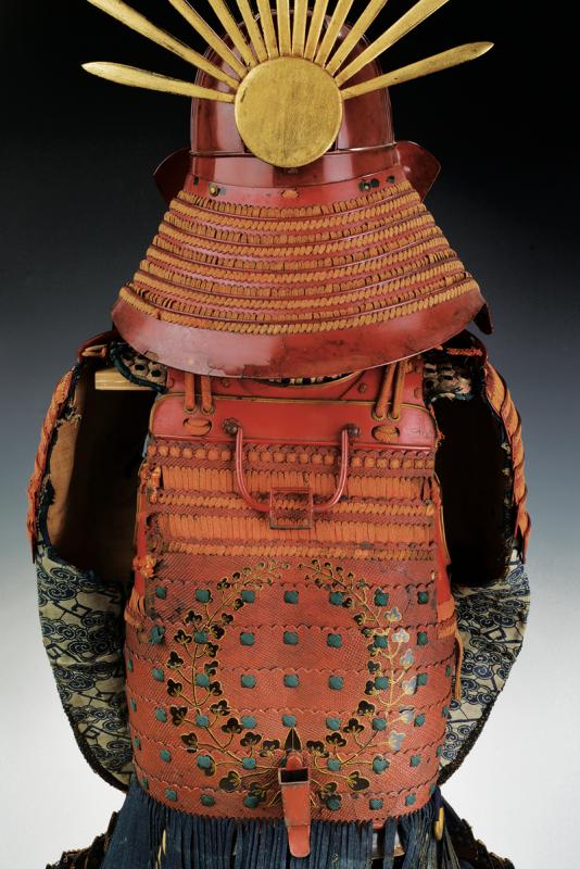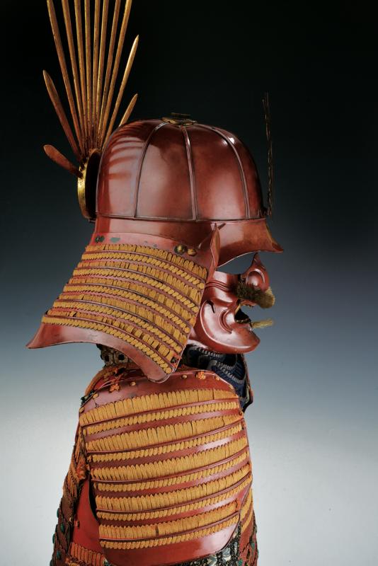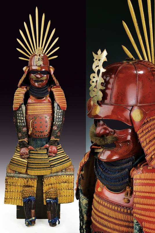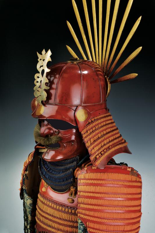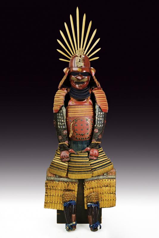 Elegante Maki-e-Do Gosoku (Armatura da Samurai), datazione: Periodo Edo (1603-1867) provenienza: Giappone, Akodonari Kabuto in ferro a otto piastre in lacca rossa completo di Tehen dorato. Dotato di Banrin ushirodate (fregio posteriore) a raggiera e Maedate a caratteri sanscriti (fregi più recenti). Hineo Shikoro a sei lame con allacciatura in Kebiki Odoshi in seta. Mabizashi e fukigaeshi con Wa Kamon della famiglia Tojo. Ressei Menpo in lacca rossa con naso rimovibile e mustacchi. Yodarekake a quattro lame. Okegawa Do sempre in lacca rossa con fregio a glicine (Fuji mon) in lacca nera e oro sul petto. Kusazuri in lacca oro a cinque lame in kiritsuke kozane; allacciatura color verde scuro, en suite con l'Hishi-toji (allacciature incrociate) del Do. Haidate a lamelle. Dotata di suneate in lacca rossa, Kote con Sode in lacca rossa, pertinenti. Completa di cassa da trasporto in legno. Epoca: inizio periodo Edo. altezza 150 cm.