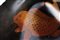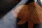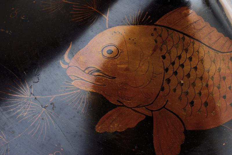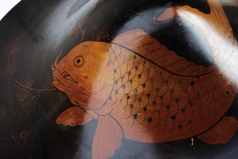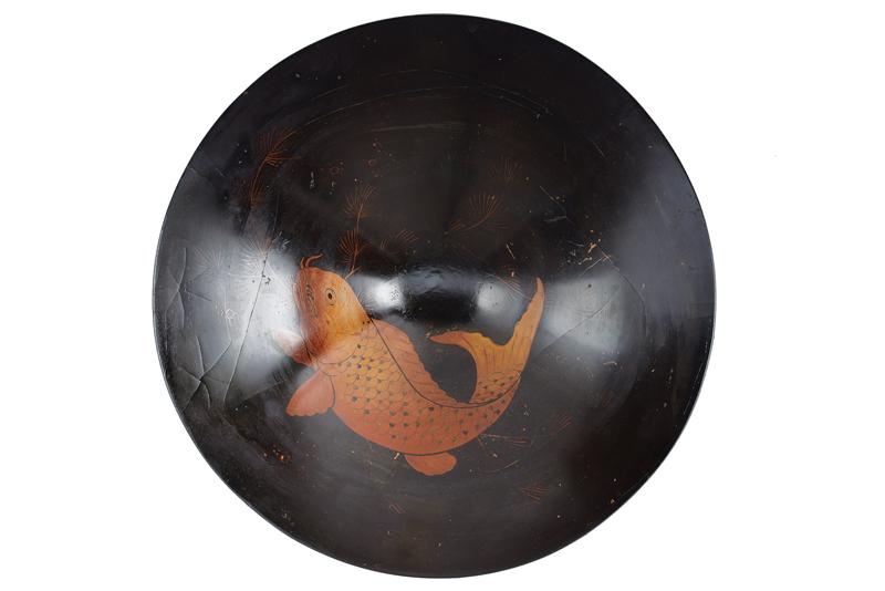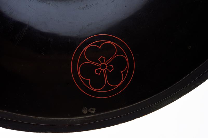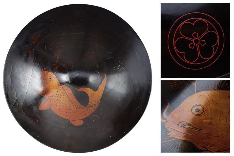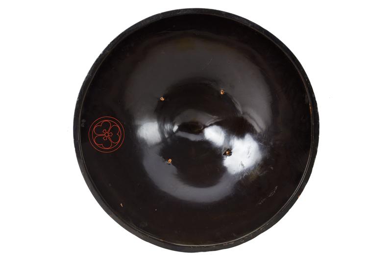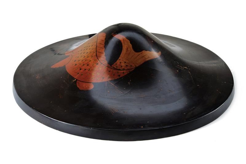 Jingasa, datazione: Periodo Edo (1603-1867) provenienza: Giappone, Di forma circolare, rivestito in lacca bruna con bel decoro a carpa recante resti di doratura, e con tracce di altri disegni. L'interno probabilmente restaurato, con quattro attacchi in rame e Katabami Mon color rosso. Epoca: tardo periodo Edo. diametro 40,5 cm.