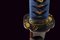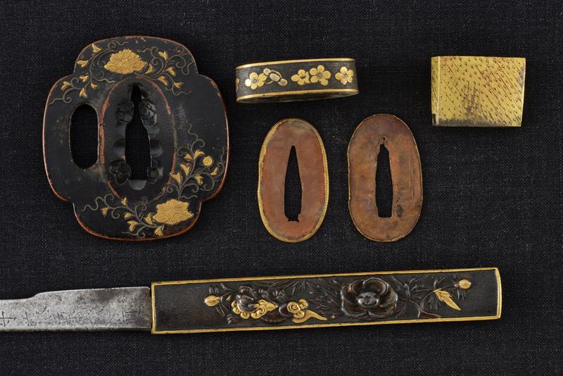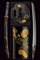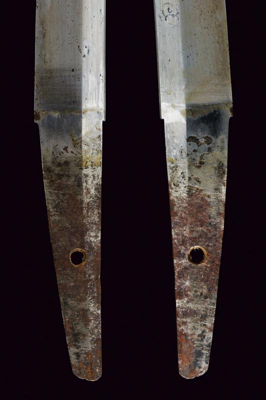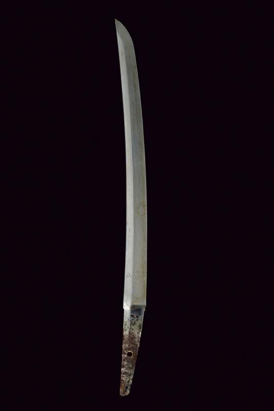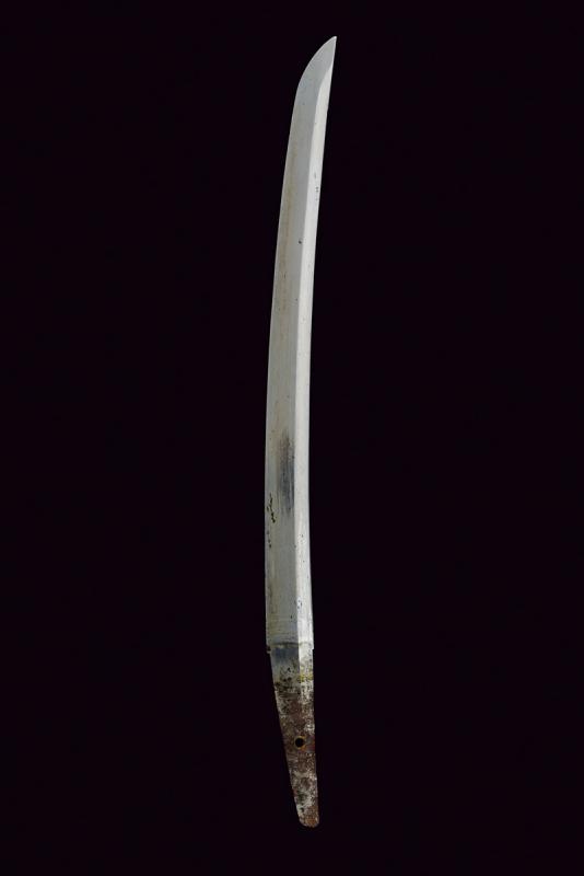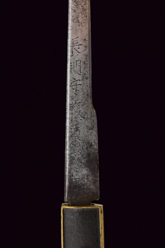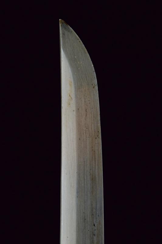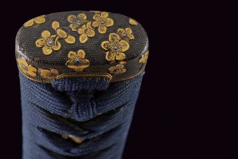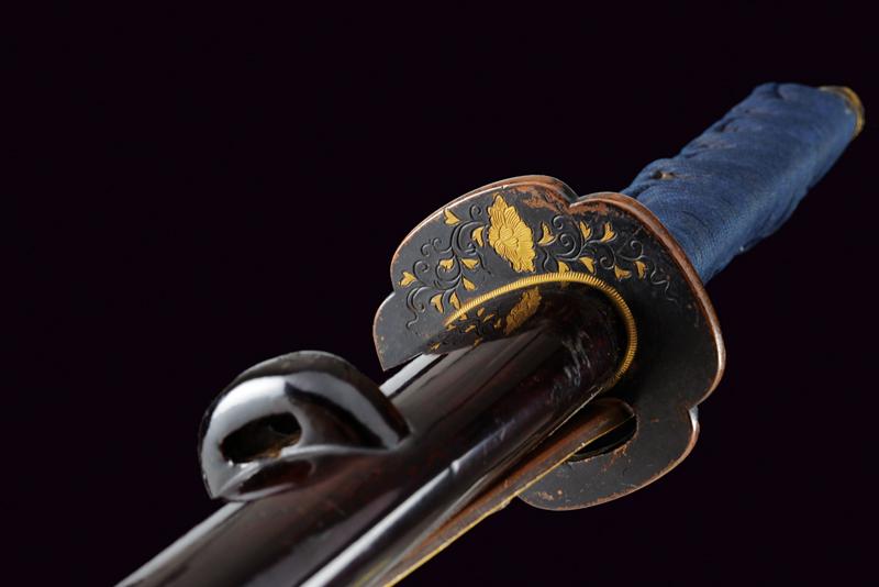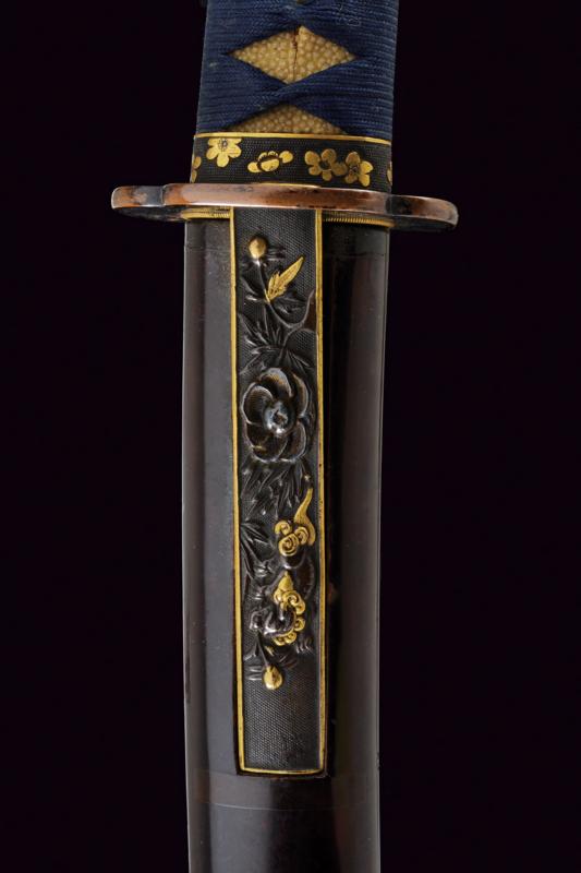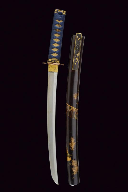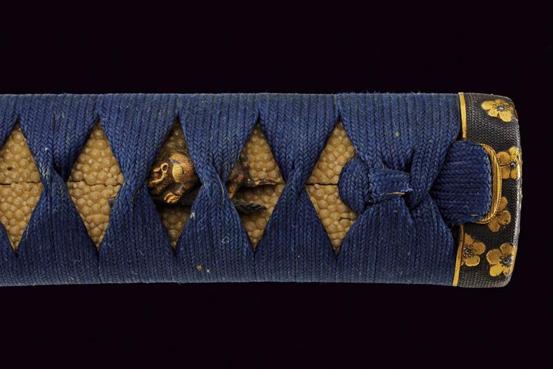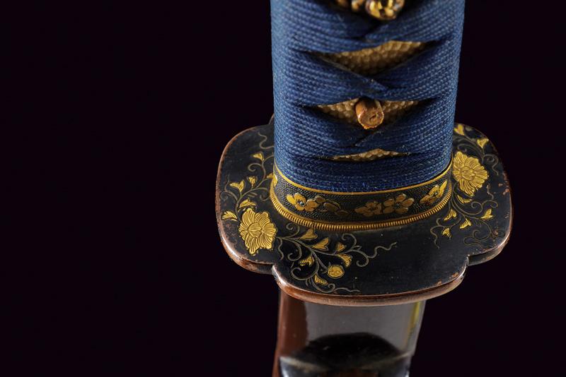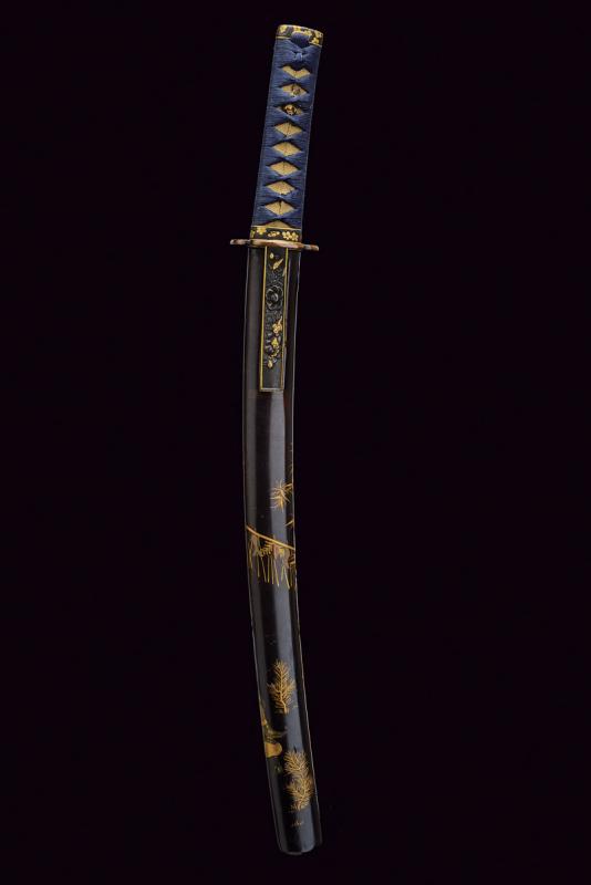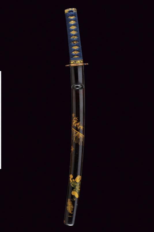 Elegante tanto con effige di Daikokuten, datazione: XIX Secolo provenienza: Giappone, Lama (nagasa 30,5 cm, da pulire, un lieve dentino) con hamon e hada non chiaramente visibili. Nakago con un mekugi-ana. Mumei. Raffinato Koshirae con Habaki dorato e decorato a tacche. Tsuba di forma Mokko in shakudo a fondo brunito e con fiori incisi e dorati. Fuchi e kashira in shakudo con fiori di ciliegio dorati. Same in pelle di razza bianca. Menuki a tigri in rilievo. Tsuka-ito in seta blu antica. Bellissima Saya laccata lucida color bruno-rossiccio (lievissime mancanze alla finitura), recante alberi di bambù in oro in rilievo e effige della divinità Daikokuten, divinità dell'abbondanza, la cui veste è color azzurro con disegni in oro. Completo di kozuka con kogatana firmato. Epoca: fornimenti e lama del tardo diciannovesimo secolo Edo/Meiji. Il proprietario ha dichiarato che il tanto è di proprietà della famiglia sin dalla fine dell'ottocento. lunghezza 46 cm.