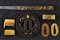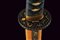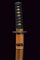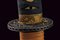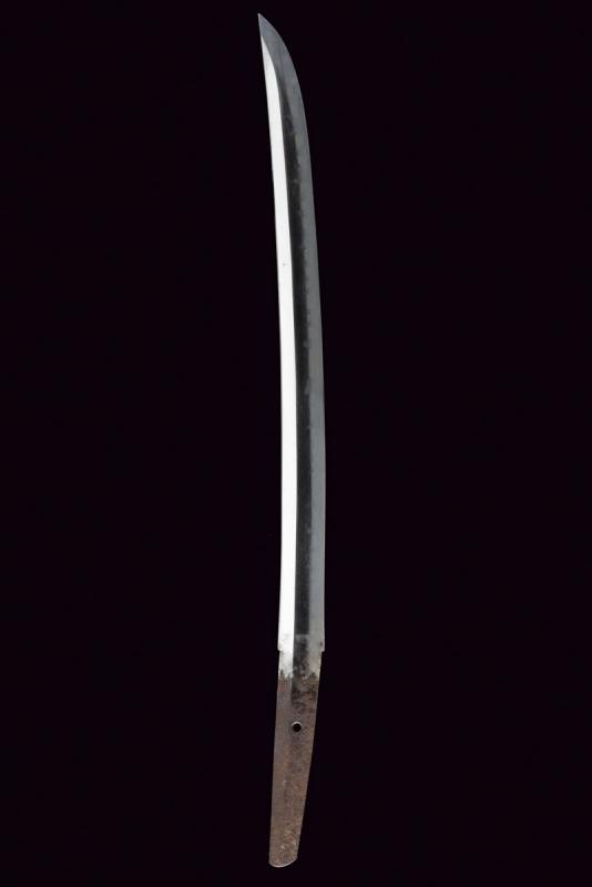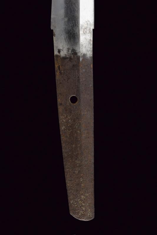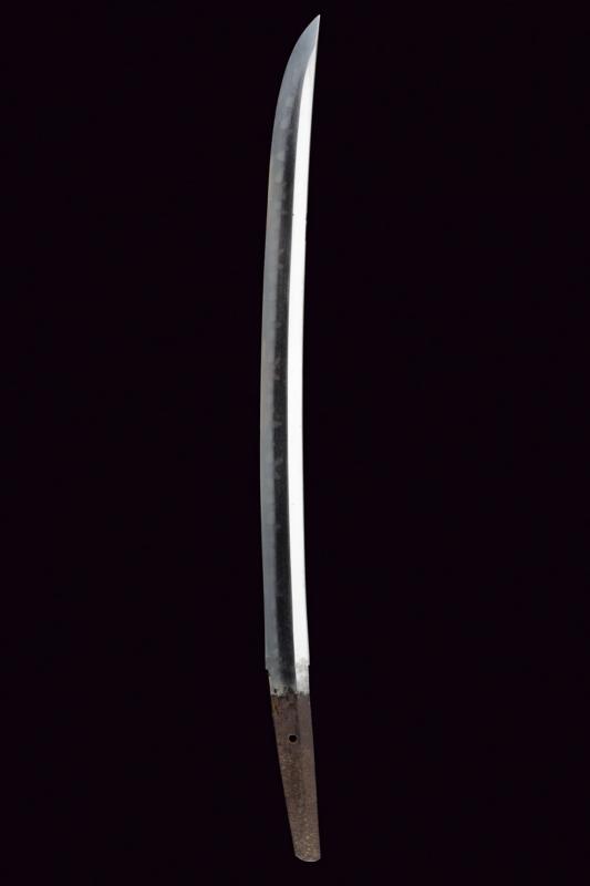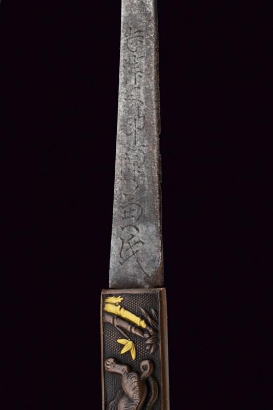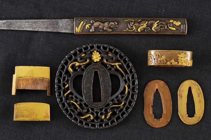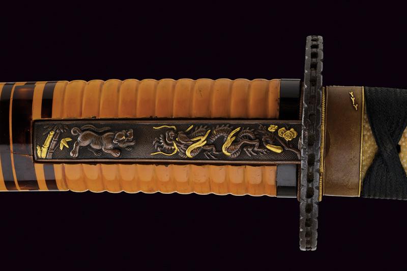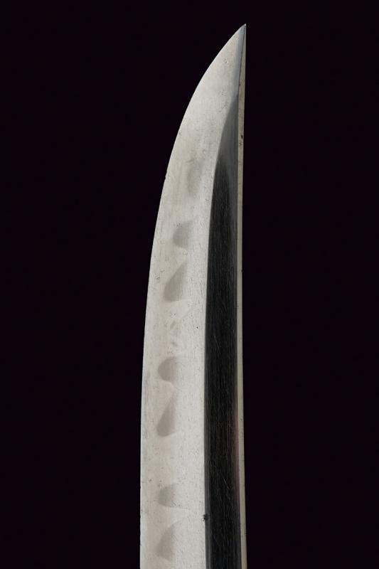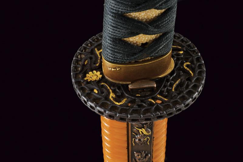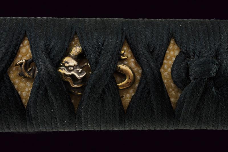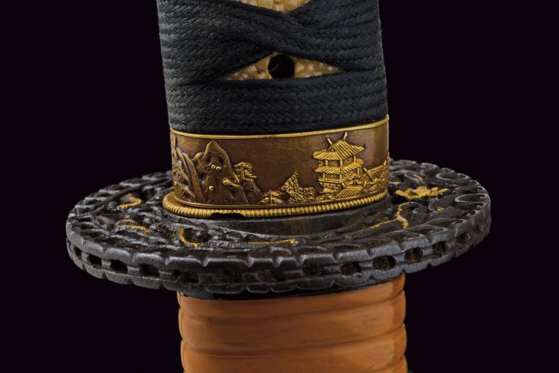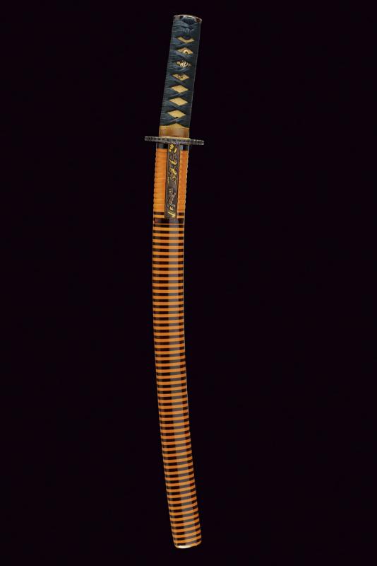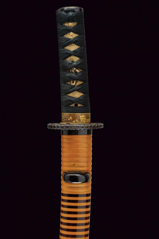 Wakizashi, datazione: 1860 circa provenienza: Giappone, Nagasa (38.3 cm) con hamon (gunome, kaninotsume) e hada ben visibile, habaki in ottone decorato a sottili scanalature; nakago mumei con un mekugi ana. Bellissima koshirae con tsuba riccamente traforata, anche sul bordo, e decorata a motivi floreali in oro. Fuchi decorata con una torre e montagne parzialmente dorate, kashira in corno scuro, menuki con draghi. Tsuka in seta scura. Saya in legno laccato con fornimenti in corno scuro, la parte superiore con scanalature orizzontale in lacca marrone chiaro, poi liscio e ad anelli alternati color marrone scuro e marrone chiaro. Ko-katana mei con kozuka in shakudo raffigurante un orso e un drago fra palme e ciliegio in altorilievo parzialmente dorato. La forma del nakago indica una epoca attorno l'inizio del XVI secolo. Il hamon ricorda Suke Sada (Bizen) che usava il hamon Kaninotsume (chele di granchio), ma il tipo di hamon fu anche usato in altre scuole a questo tempo. lunghezza 56.5 cm.
