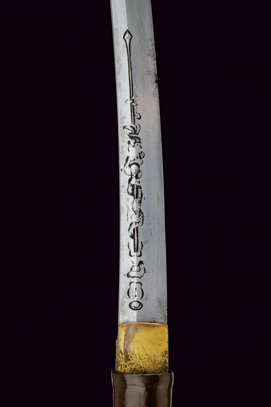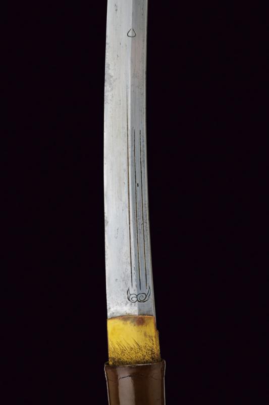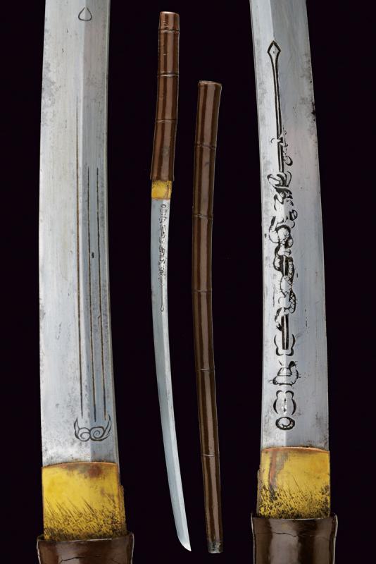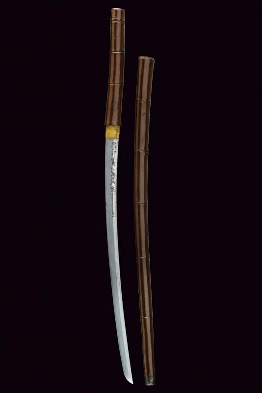 Wakizashi con rara montatura shikomizue, datazione: Fine del XIX Secolo provenienza: Giappone, Lama shinogi zukuri (nagasa 51,6 cm, condizioni medie) con resti di decorazione ad intaglio a drago. Habaki in rame dorato. Tsuka in bambù laccato color marrone, con ghiera in ottone. Fodero a bastone in bambù, anche questo con finitura laccata. La lama montata in epoca antica e probabilmente mai smontata, rimuoverla comporterebbe probabilmente il danneggiamento della lacca, si è preferito lasciarla quindi nel suo stato originario. Lunghezza totale chiusa: 88,5 cm. Interessante montatura inusuale a bastone animato. Il proprietario ha dichiarato che il Wakizashi è di proprietà della famiglia sin dalla fine dell'ottocento. lunghezza 75,7 cm.