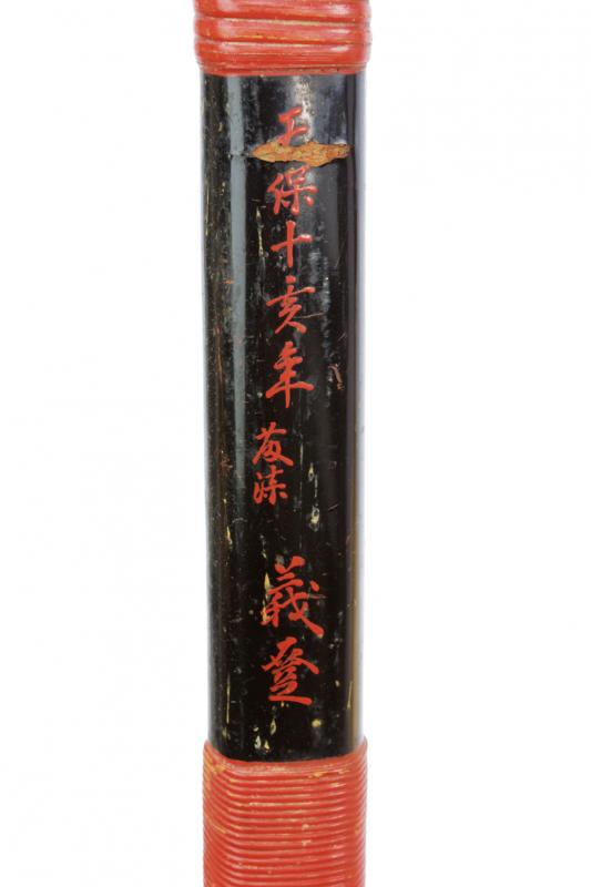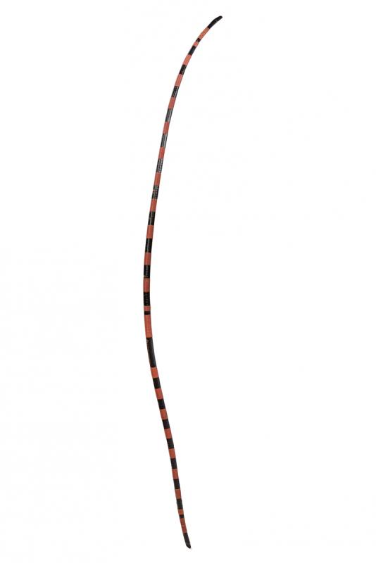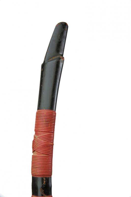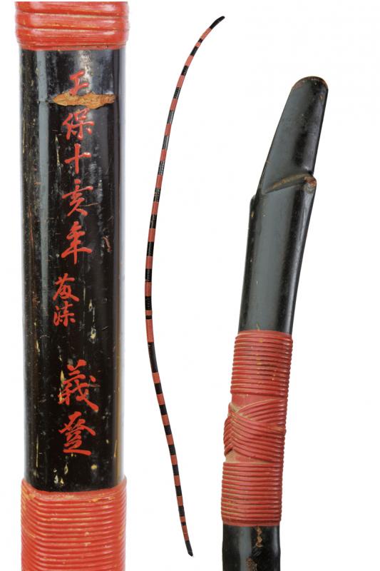 Yumi (arco), datazione: XIX Secolo provenienza: Giappone, Struttura lignea laccata nera, tipica forma asimmetrica. Piccole mancanze alla lacca. Con fasci di bande avvolte laccate color rosso. Al centro firma in ideogrammi rossi. altezza 208 cm.