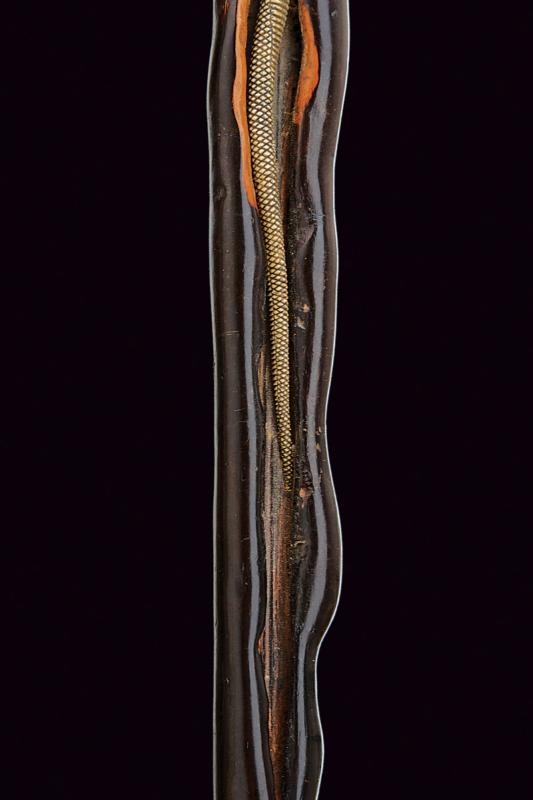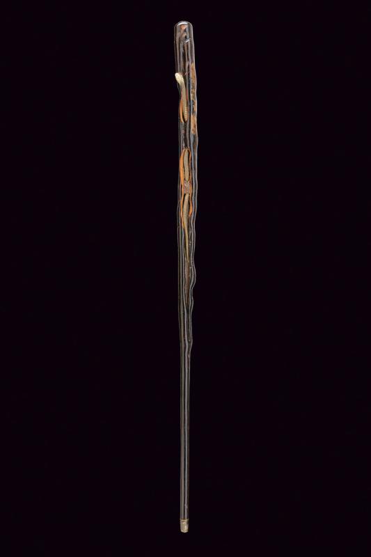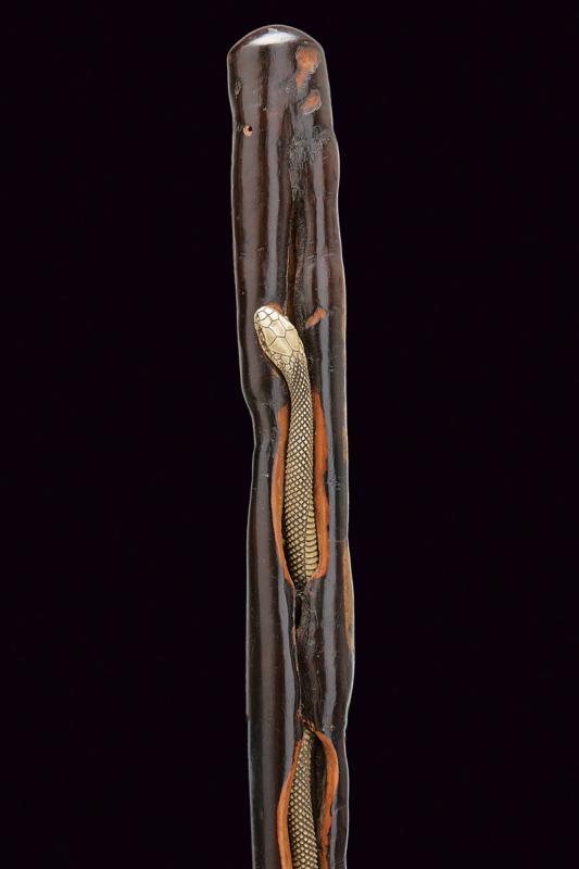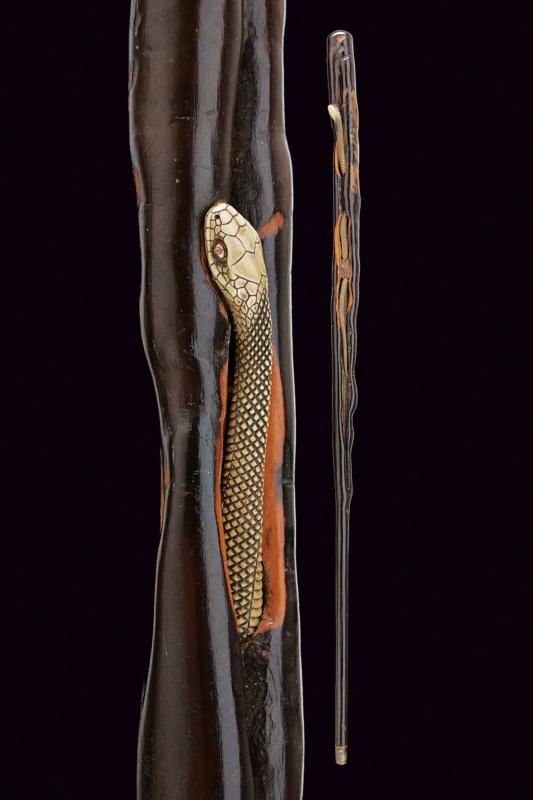 Elegante bastone da passeggio, datazione: 1880 - 1890 circa provenienza: Giappone, Fusto in legno nodoso, parzialmente cavo, all'interno della cavità inserita una fine scultura probabilmente in avorio lavorata a tuttotondo ad effigiare un serpente, gli occhi in vetro color miele. La superfice del bastone con finitura bruna. Il piede in ferro. altezza 88,5 cm.