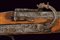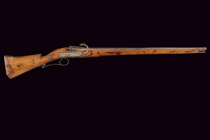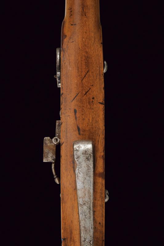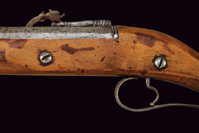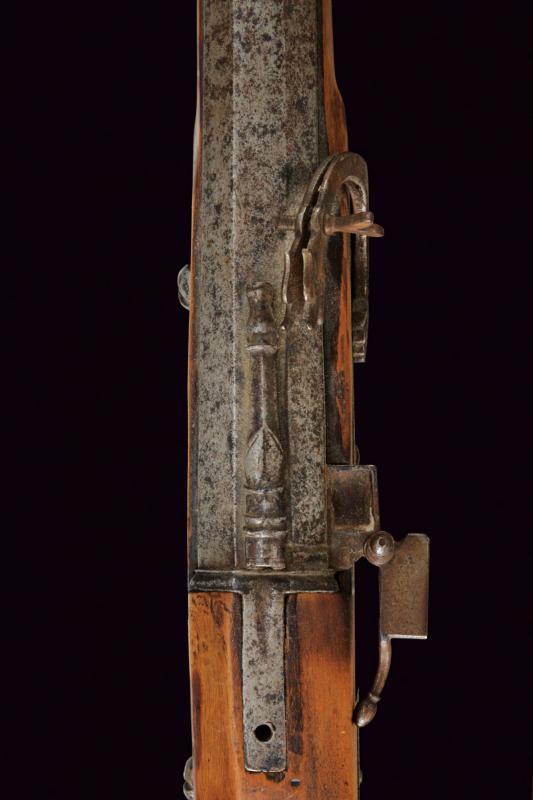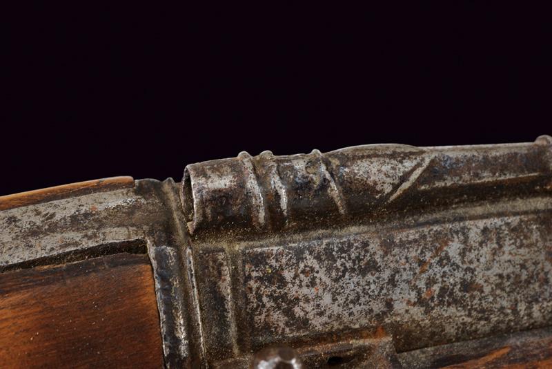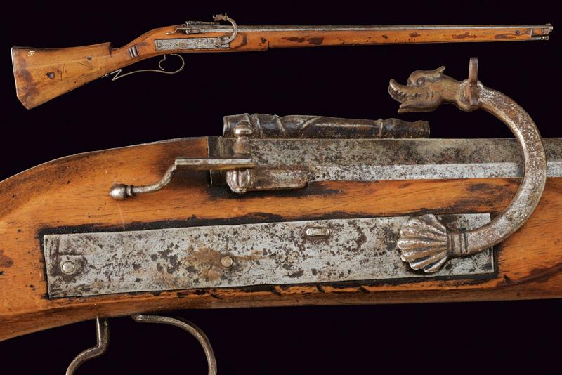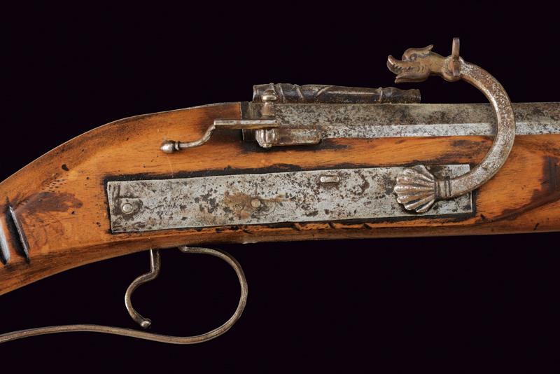 Raro fucile a miccia, datazione: ultimo quarto del XVI Sec. provenienza: Italia, Pesante canna liscia, ottagonale, ristretta verso la volata, culatta con traguardo a tubo intagliato a figura umana, scodellino laterale con copriscodellino girevole, mirino, cal. 16 mm; batteria a cartella rettangolare, piatta, cane a drago con base a palmette; cassa in legno con calcio faccettato, fornimenti in ferro, bacchetta in legno con battipalla in ferro. Raro. Provenienza: Collezione Dott. Massimo Paleari Henssler. lunghezza 134,5 cm.