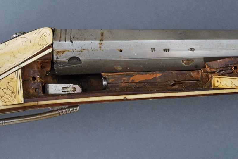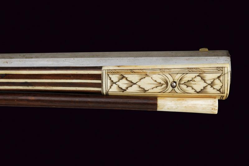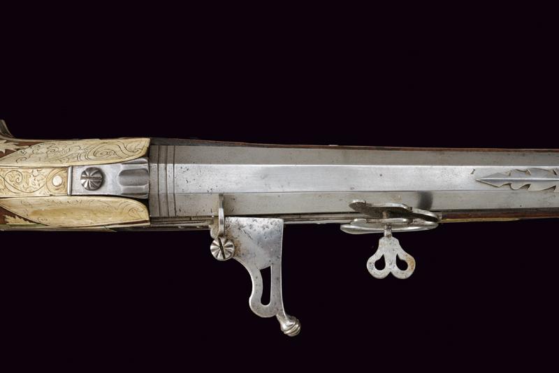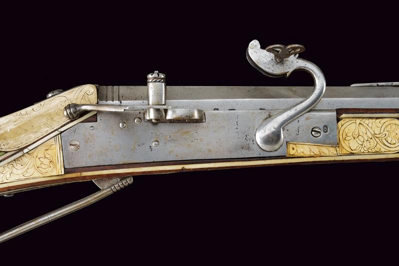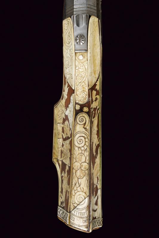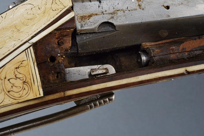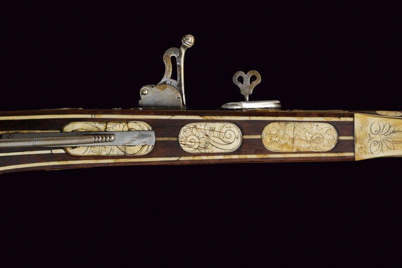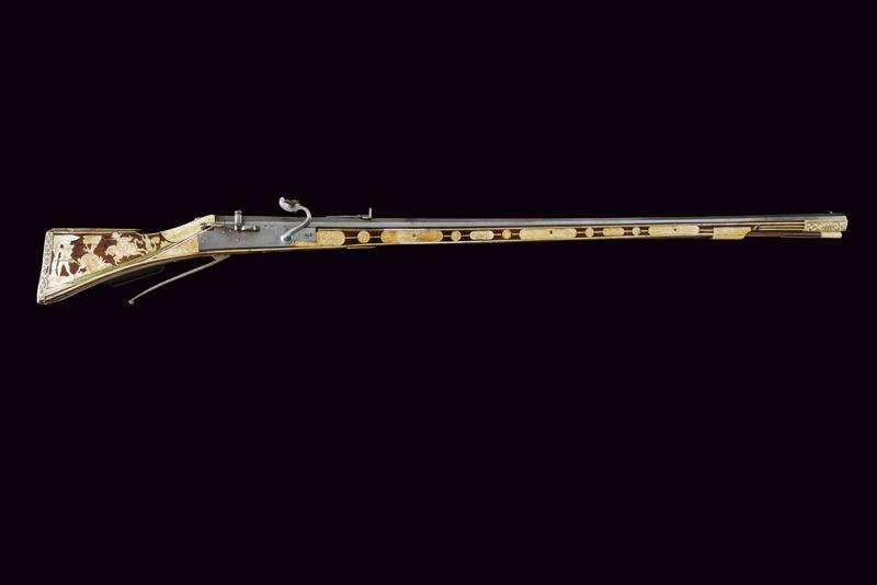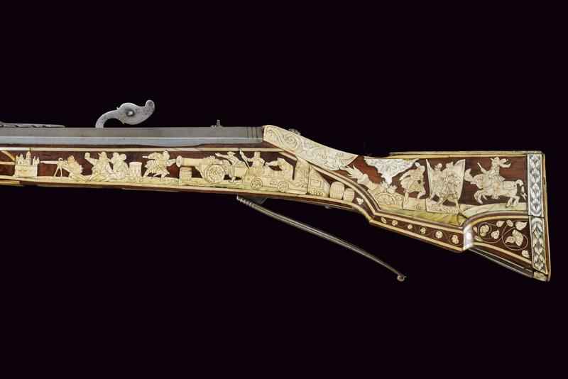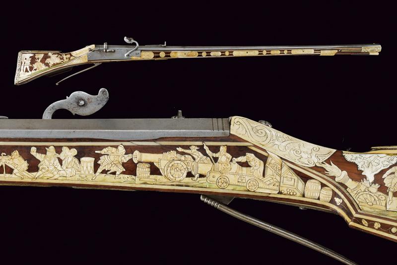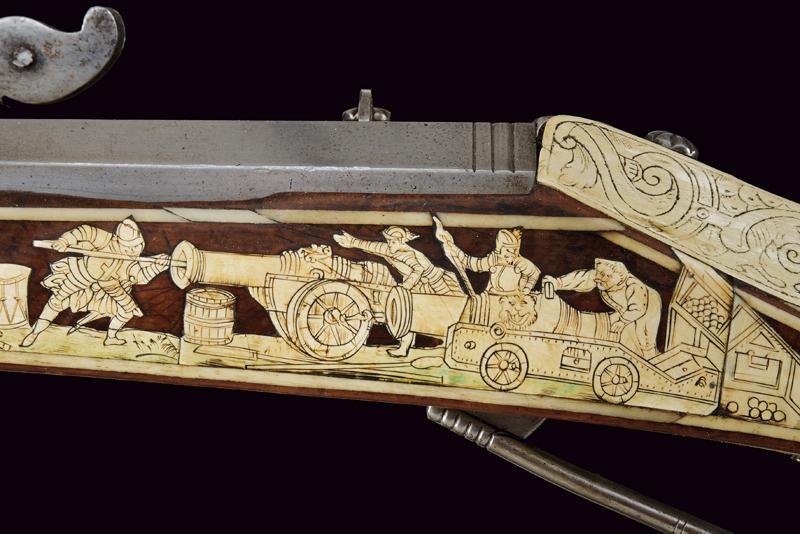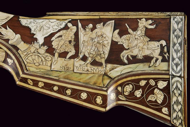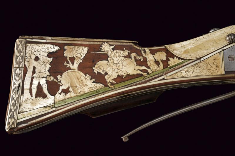 Bellissimo archibugio a miccia, datazione: Fine del XVI Secolo provenienza: Olanda, Pesante canna rigata, ottagonale, la base con tre cornici, lateralmente due punzoni poco leggibili e '15.6' (probabilmente il calibro), alzo fisso decorato con una foglia intagliata, il mirino in ottone, cal. 15.6 mm. Scodellino laterale con copriscodellino traforato con una finestra e con pomolo intagliato.Codetta con traguardo, la vite intagliata a fiore. Batteria a cartella piatta con cane a serpente, il bordo destro con marca recante un giglio in ovale. Cassa intera in legno riccamente decorato con placche in osso, parzialmente tinte color verde, alcune di restauro, il calcio sul lato della batteria con scena di caccia al cinghiale, la parte opposta e la parte della contropiastra con bellissimi raffigurazioni militari con cavalieri e soldati in veste del XVI secolo con canoni, barili di polvere, palle di cannone, fucile a miccia, tamburo e castello. Il resto decorato a liste, luppolo e placche circolari ed ovali a motivi floreali. Lungo grilletto in ferro. Bacchetta in legno con battipalla in osso. Piccole mancanze e difetti. Provenienza: Vendita Galerie Fischer, Lucerna, Settembre 2010, lotto 554 con aggiudicazione a 20.000 fs.Fucili a miccia decorati con intarsi in osso sono rari e sempre stati oggetti di collezionismo ad alto livello.La descrizione di Lucerna descrive il fucile come tedesco, é però più probabile che si tratta di un lavoro olandese. In favore di questa attribuzione vedi simili oggetti nella collezione Visser, part I cat. no. 1,2,3, pagine 44/49 ed un'altro nella collezione Rothschild in Waddesdon Manor (di Claude Blair) no. 96 pag. 243/246. lunghezza 165 cm.