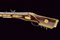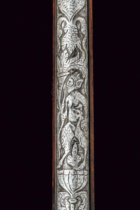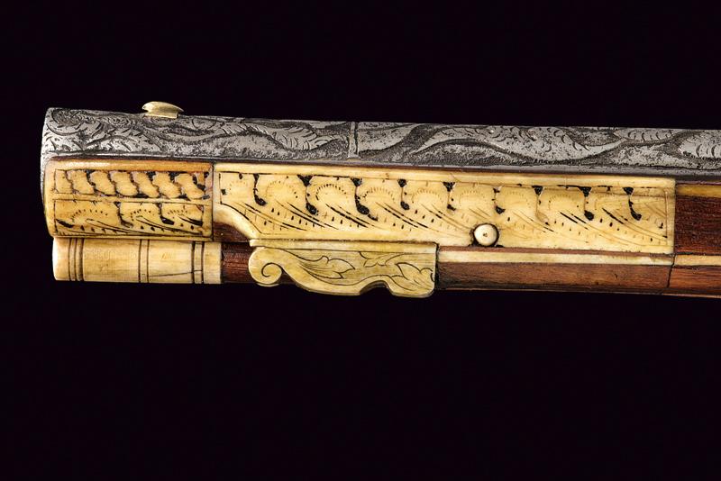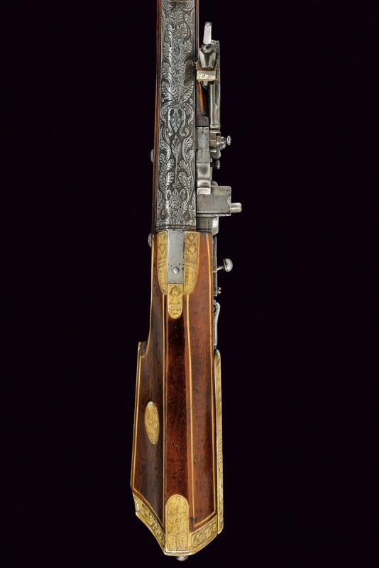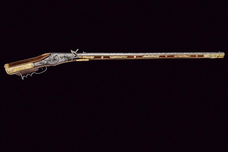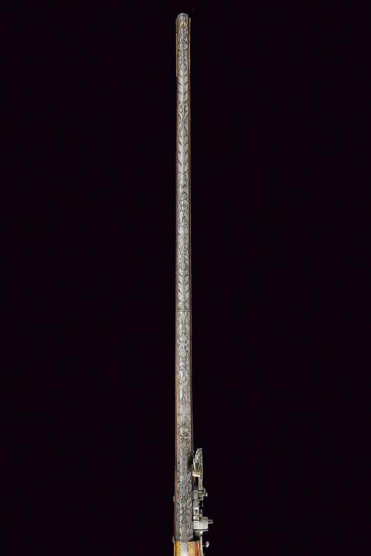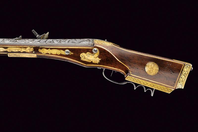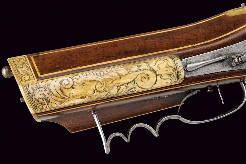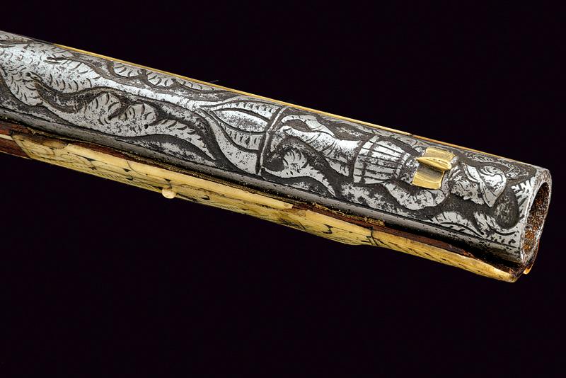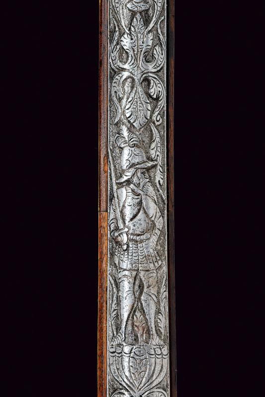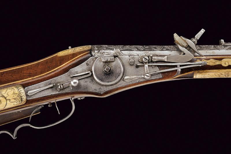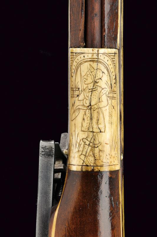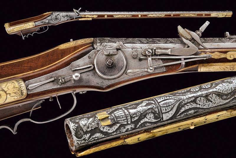 Bel fucile a ruota con canna intagliata, datazione: 1600 - 1620 provenienza: Norimberga, Lunga canna liscia, con la superficie visibile completamente intagliata, recante un guerriero in armatura e spada del 1600 circa, un diavolo e un guerriero all'antica fra disegni floreali, il punzone di Norimberga, munita di traguardo di ricambio e mirino in ottone, cal. 18 mm; codetta liscia. Batteria a cartella liscia con ruota esterna, copriscodellino scorrevole a scatto, cane e ruota leggermente incisi; sicura. Cassa intera in legno di frutto decorata con tarsie in osso a placche e liste incise, recanti un guerriero, un drago, una testa di leone, vari animali grotteschi e decorazioni floreali. Ponticello anatomico in ferro, stecher, bacchetta in legno con base in ferro e battipalla in osso inciso. lunghezza 139.5 cm.