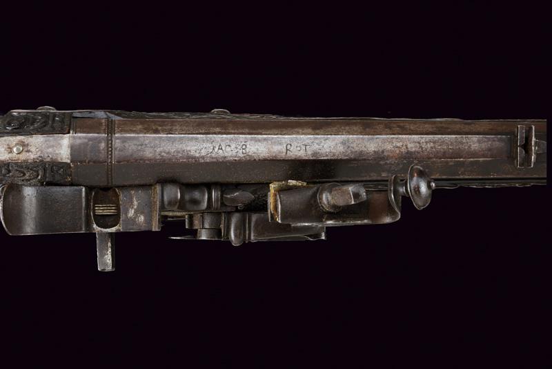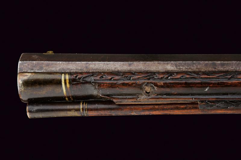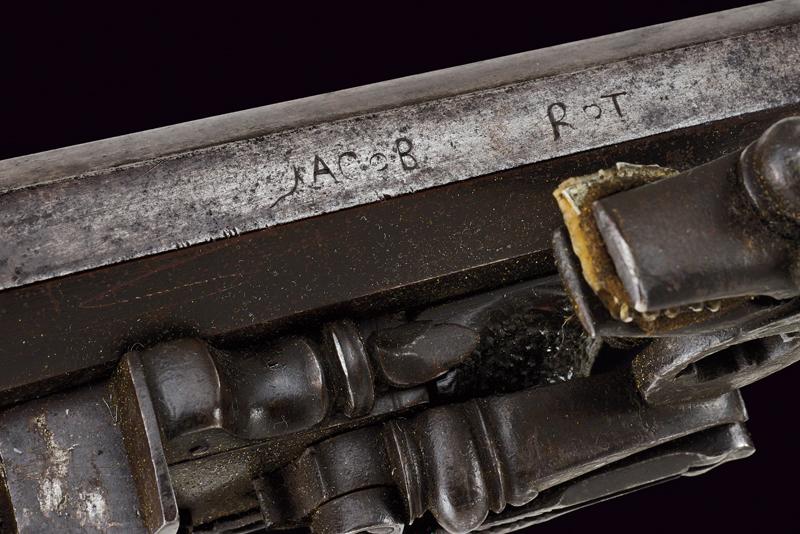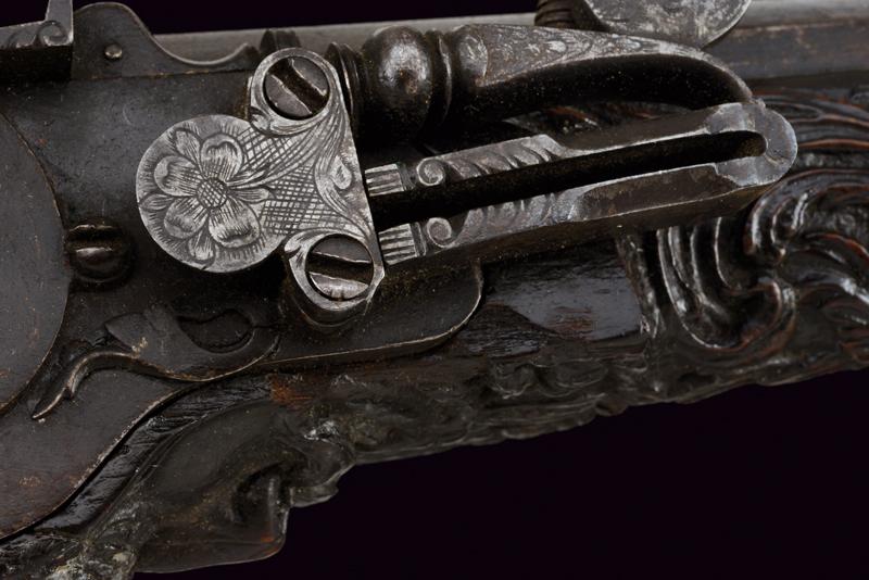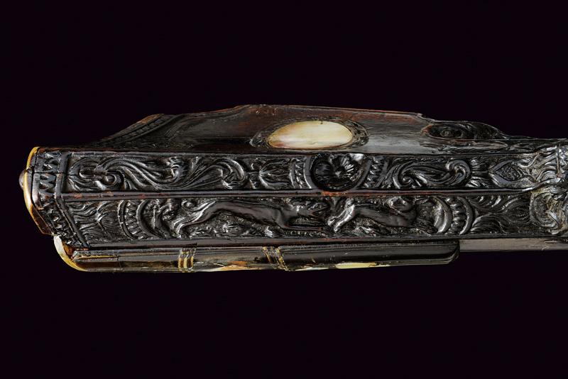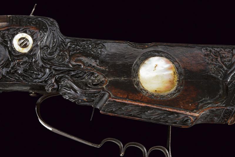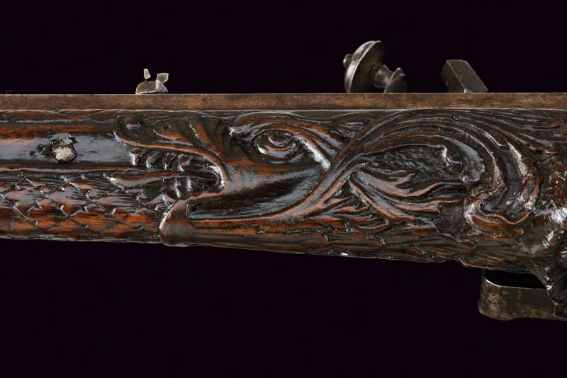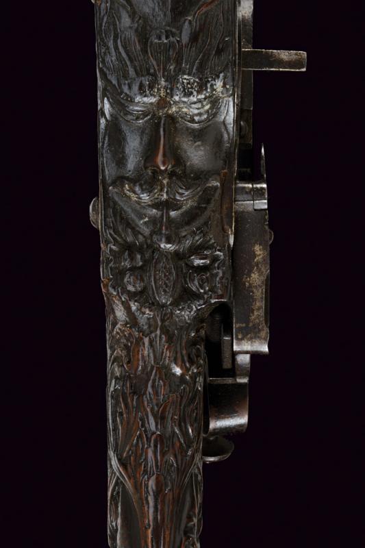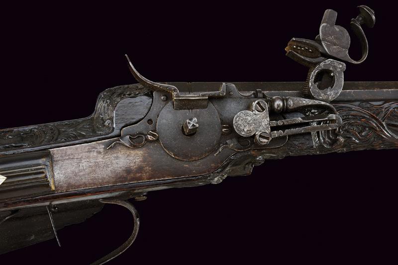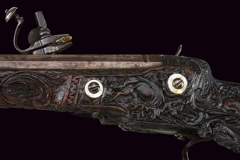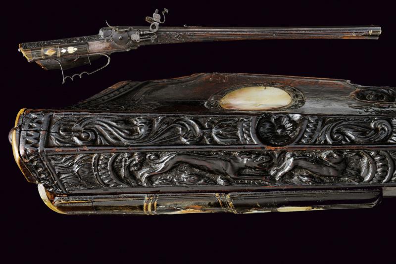 Fucile a ruota con cassa in stile della bottega di Michael Maucher, datazione: terzo quarto del XVII Sec. provenienza: Germania del Sud, Canna ottagonale, rigata, con cornice alla base, firmata 'JACOB ROT', alzo in ferro e mirino in ottone, cal. 13 mm; batteria a ruota con cartella piatta, intagliata con due riccioli ed incisa a motivi floreali su cane e copertura della molla, para-scintille e copriscodellino scorrevole. Cassa intera in legno riccamente scolpito in alto e bassorilievo con animali del bosco, segugio, motivi floreali, grande mascherone sotto la batteria e testa di mostro alla base della canna. Patchbox e guancia decorati con intarsi in madreperla. Ponticello anatomico in ferro. Stecher. Bacchetta originale in legno con battipalla in corno e cavastracci in ottone e ferro. Piccole mancanze e difetti. Le parti in ferro con patina scura (da pulire). Interessante fucile a ruota che potrebbe essere stato creato nella bottega della famiglia Maucher a Schwäbisch Gmünd in Germania del Sud, famosi per i loro lavori in avorio e legno scolpito. Vedi esempi delle loro opere in 'Die Waffensammlung von Schloss Dyck', A. Hoff, pag. 135, tavola 4. 'Die Grossen Büchsenmacher', Schedelmann, pag. 157/158. Un grande gruppo di armi sono presenti nel catalogo del Bayerische Natianalmuseum 'Handfeuerwaffen' no. 43-48, pag. 60-72.Provenienza: Hermann Historca, Monaco di Baviera, Nov. 2019 lotto 29 stimato per 14.500 Euro. lunghezza 108 cm.