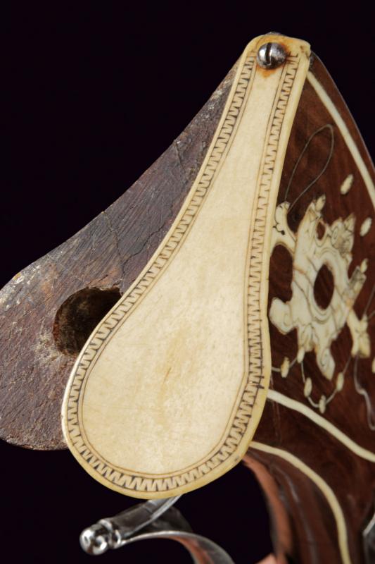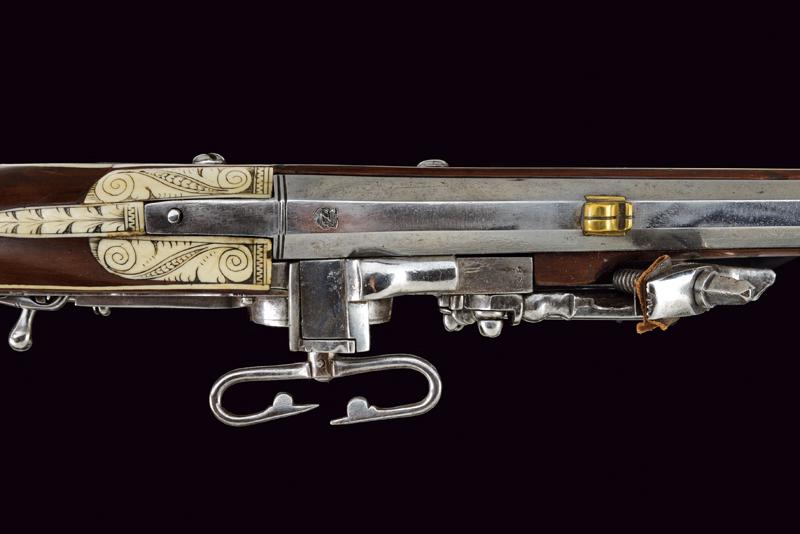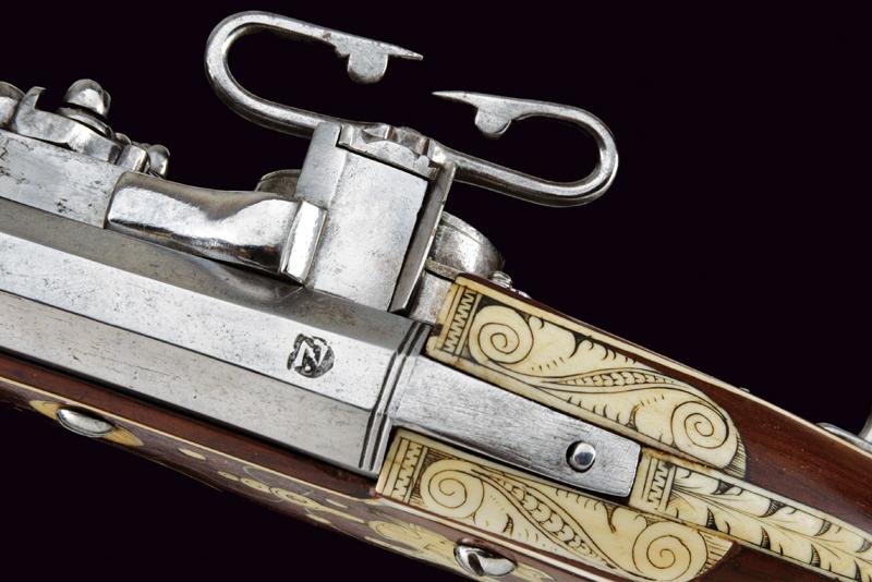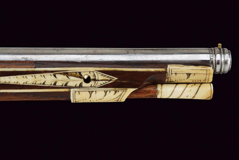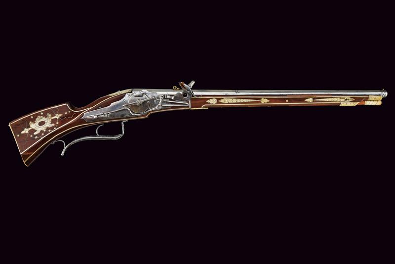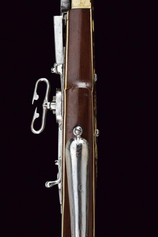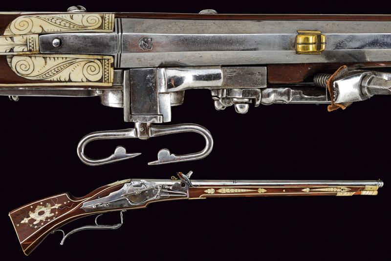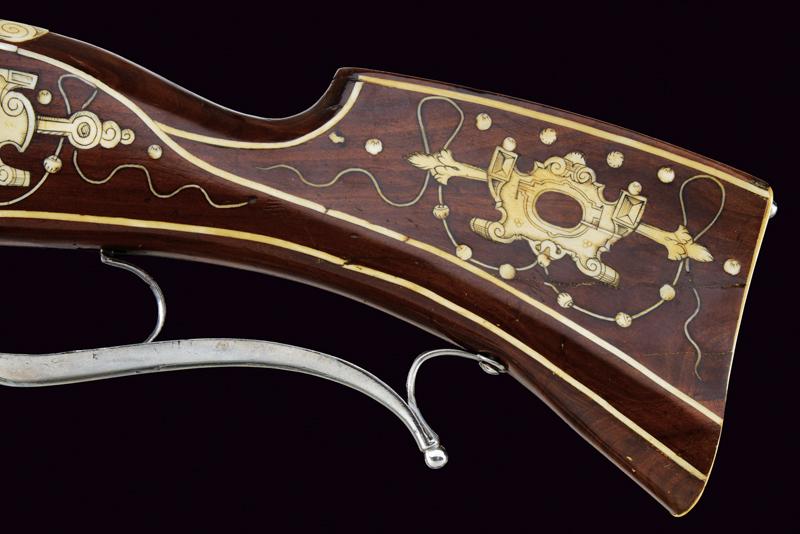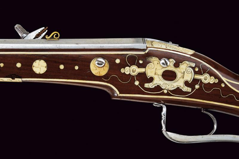 Carabina a ruota della guardia del Principe Vescovo Wolf Dietrich von Raitenau, datazione: 1600 circa provenienza: Salisburgo, Canna rigata, a due ordini con anelli al cambio, la base con profonda marca 'Z' entro uno scudo, alto traguardo in ottone, la parte tonda con volata a cannoncino e mirino, cal. 11 mm; batteria a cartella piatta, ruota con copertura e chiave a ruota integrata, sicura a molla e copriscodellino mobile; cassa intera in legno di frutto (restauri) decorato con i tipiche tarsie in osso incise a motivi floreali, liste e finestre; lungo ponticello in ferro. Bacchetta in legno con battipalla in osso. La marca 'Z' sta per G. Zellner di Zell am Wallersee, Austria. Altre dodici carabine recano la stessa marca. Altri esemplari furono prodotti da Valentin Klett in Suhl. Bell'esempio di arma appartenente alla guardia del corpo del Principe Vescovo Wolf Dietrich von Raitenau (1559-1617), fondatore della città di Salisburgo, famoso perché amava fornire alle sue truppe armi di grande pregio (Il gruppo di armi includeva il carabina a ruota, uno scudo dipinto ed una alabarda). Raitenau finì in carcere per aver sedotto la figlia di un importante cittadino di Salisburgo.Secondo la pubblicazione di Alaric e Serpette in 'La Gazette des Armes' no. 200 del Maggio 1990 furono prodotte circa 100 carabine. Mentre la grande parte delle ruote furono ricoperte di fornimenti convessi, alcuni, come la nostra, furono fornite con una chiave a ruota a forma di farfalla.Carabine di questo tipo si trovano nei più importanti musei incluso il Bayrisches Nationalmuseum e certamente nel museo di Salisburgo.Diversi furono venduti ultimamente all'asta:Sotheby's: Henk Visser Collection 3 Luglio 1990 lotto 68Czerny's: Aprile 2011, lotto 1330 e Giugno 2012, lotto 962Galerie Fischer: Settembre 2015, lotto 1330 lunghezza 83.5 cm.