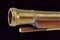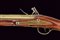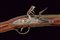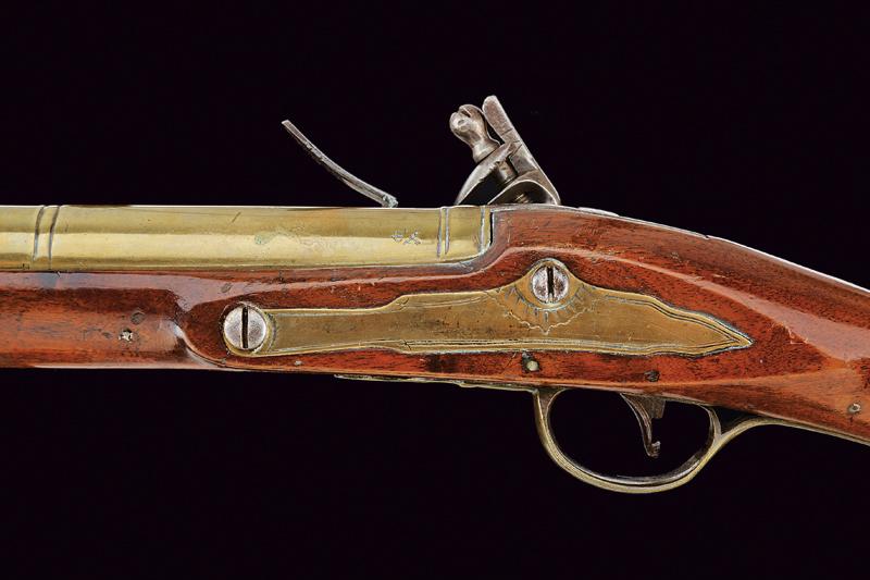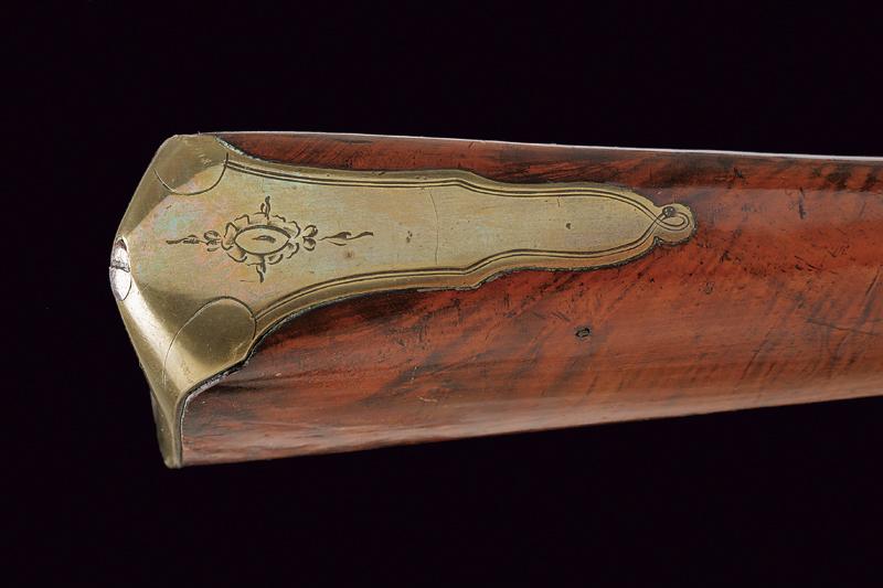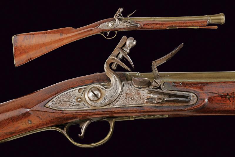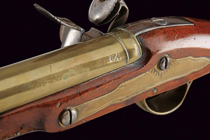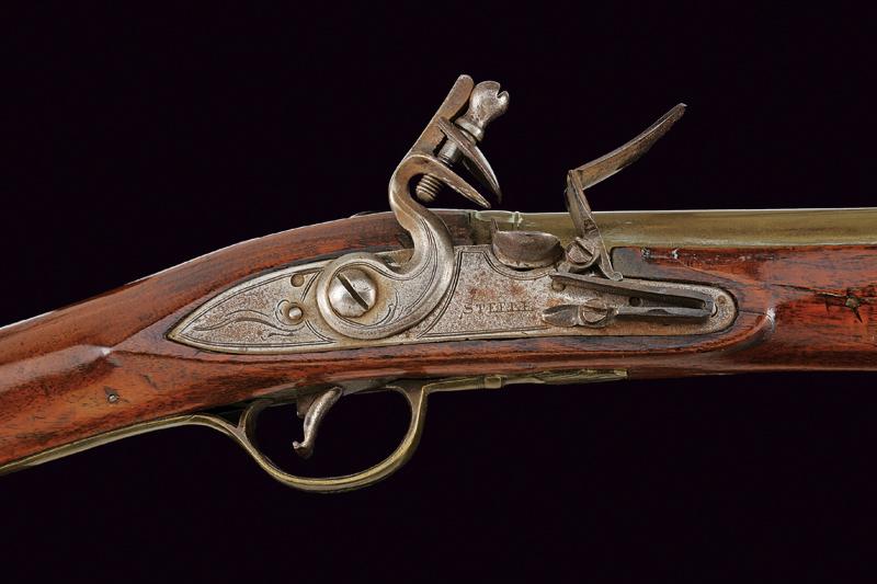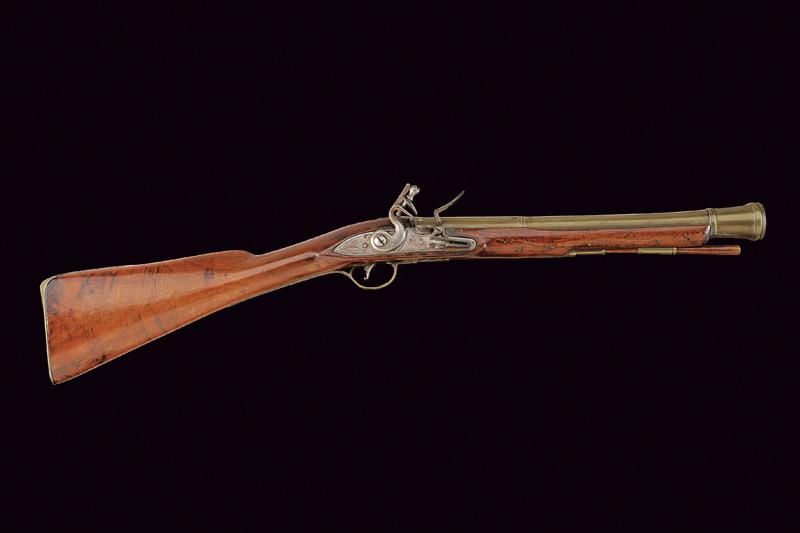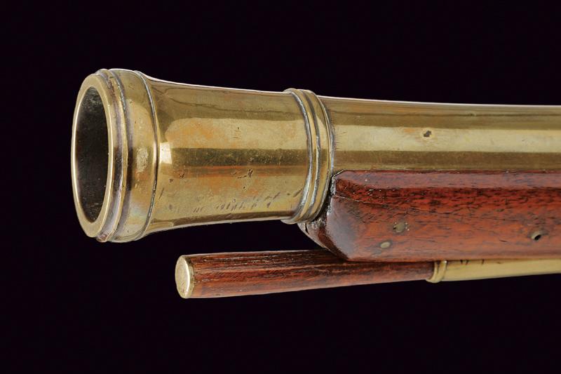 Trombone a pietra focaia di Steele, datazione: Inizio del XIX Secolo provenienza: Inghilterra, Canna liscia in ottone a due ordini tondi suddivisi da anelli, la base con punzone del banco di prova, volata con anello in rilievo, strombata a modo circolare. Codetta in ferro. Batteria a pietra focaia firmata 'STEELE', incisa ai bordi con doppie linee. Cassa intera con crepe nella prima parte e fornimenti in ottone incisi a motivi floreali. Bacchetta in legno con battipalla in ottone e cavastracci in ferro. lunghezza 75 cm.