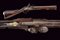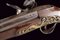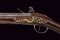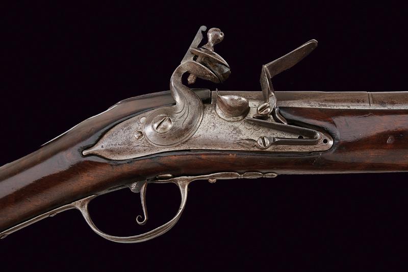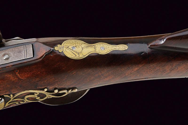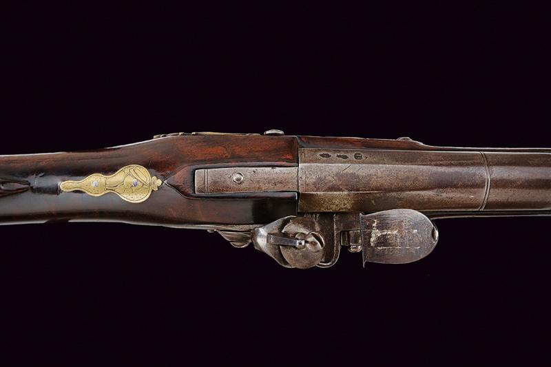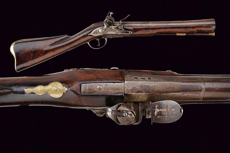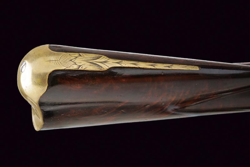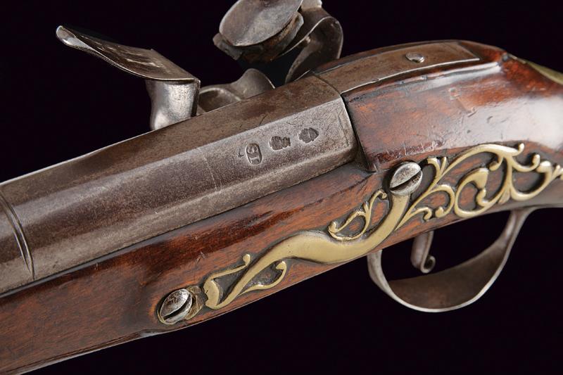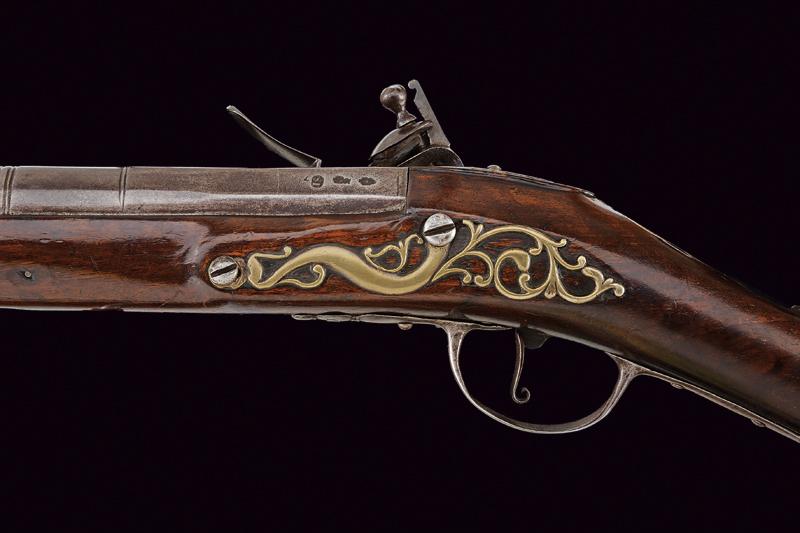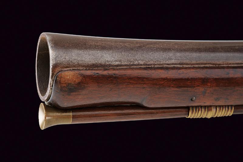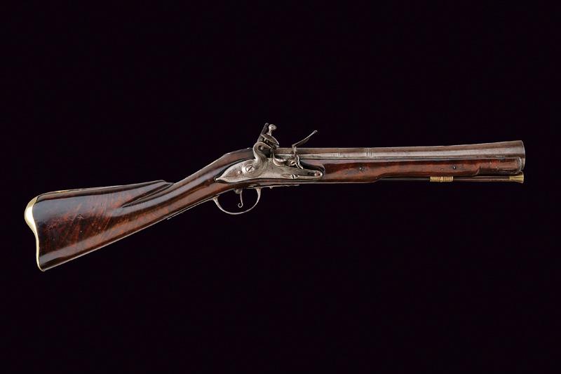 Trombone a pietra focaia di John Sibley, datazione: inizio del XVIII Sec. provenienza: Londra, Canna in ferro, liscio a quattro ordini, la prima parte ottagonale con marca di John Sibley e punzone del banco di prova di Londra, dopo un breve segmento a sedici facce, ed un altro tondo suddivisi da anelli, sempre tonda crescente verso la volata strombata a modo circolare. Batteria a cartella tonda con resti di incisioni. Cassa intera in bel legno con fornimenti in ottone, la contropiastra traforata, coccia incisa a fiorame e lo scudetto sul dorso inciso con un busto di uomo con cappello. Ponticello in ferro. Bacchetta in legno con battipalla in ottone. lunghezza 68 cm.